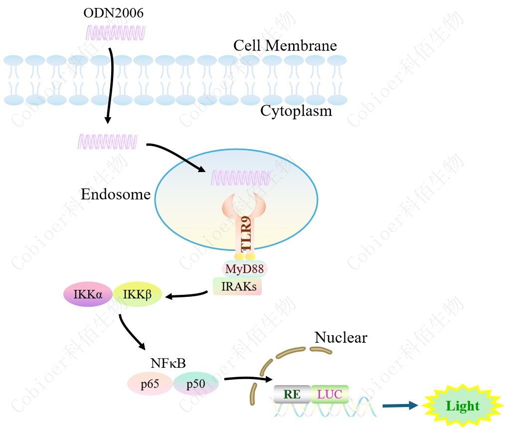 TLR9 NFκB-Luc HEK293 報(bào)告基因藥靶模型很好的模擬了體內(nèi) TLR9 的信號(hào)轉(zhuǎn)導(dǎo)過(guò)程, 原理見(jiàn)下圖所示。