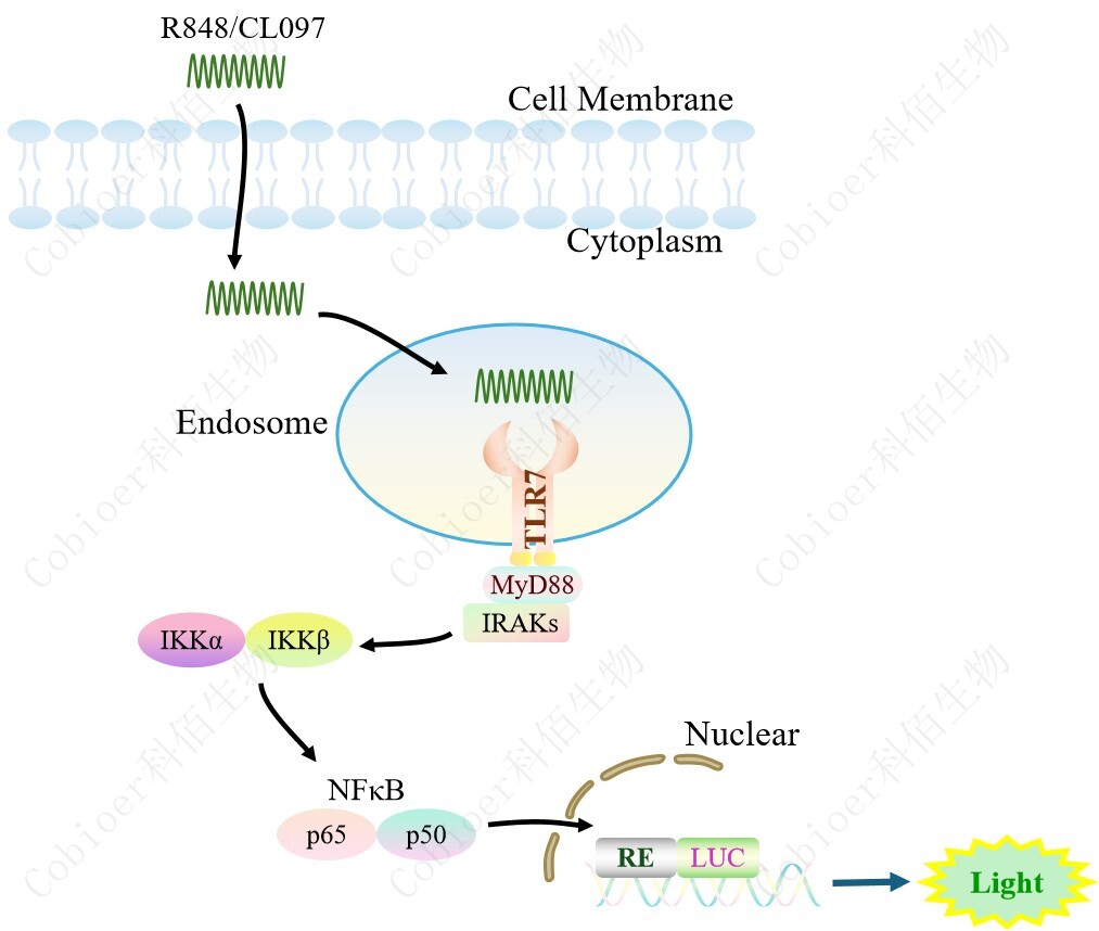 TLR7 NFκB-Luc HEK293 報告基因藥靶模型很好的模擬了體內 TLR7 的信號轉導過程, 原理見下圖所示。