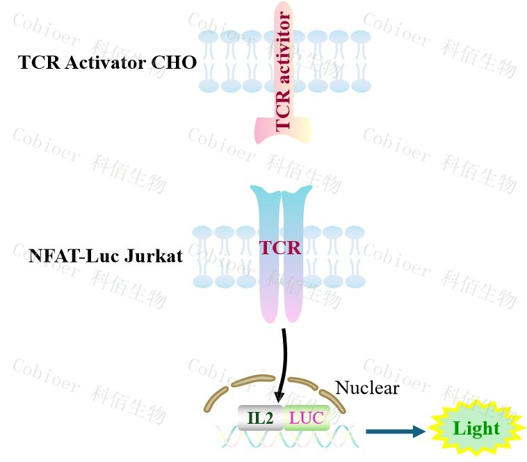 TCR Activator CHO 報告基因藥靶模型很好的模擬了體內(nèi) TCR 的信號轉(zhuǎn)導(dǎo)過程,原理見下圖所示。![]() Figure 1. TCR Activator CHO 細(xì)胞模型原理圖 |