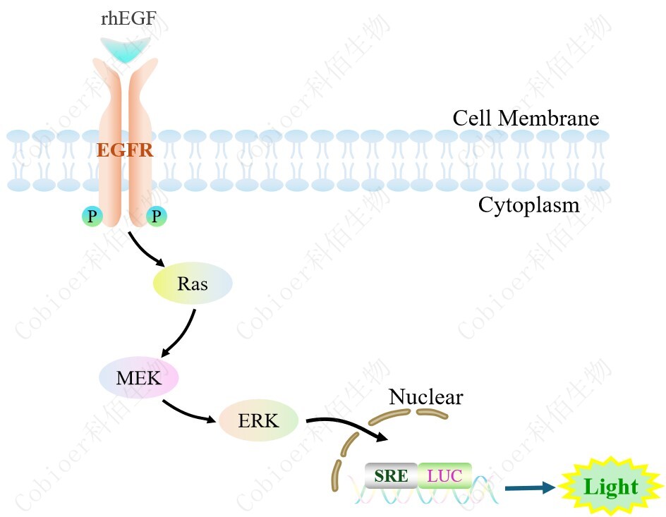 SRE-Luc HEK293 報告基因細(xì)胞是由 SRE 調(diào)控并表達(dá) Luc 熒光素酶報 告基因的 HEK293 細(xì)胞。EGF 與受體結(jié)合,激活 SRE 的原理見下圖所示。![]() Figure 1. SRE-Luc HEK293 細(xì)胞模型原理圖