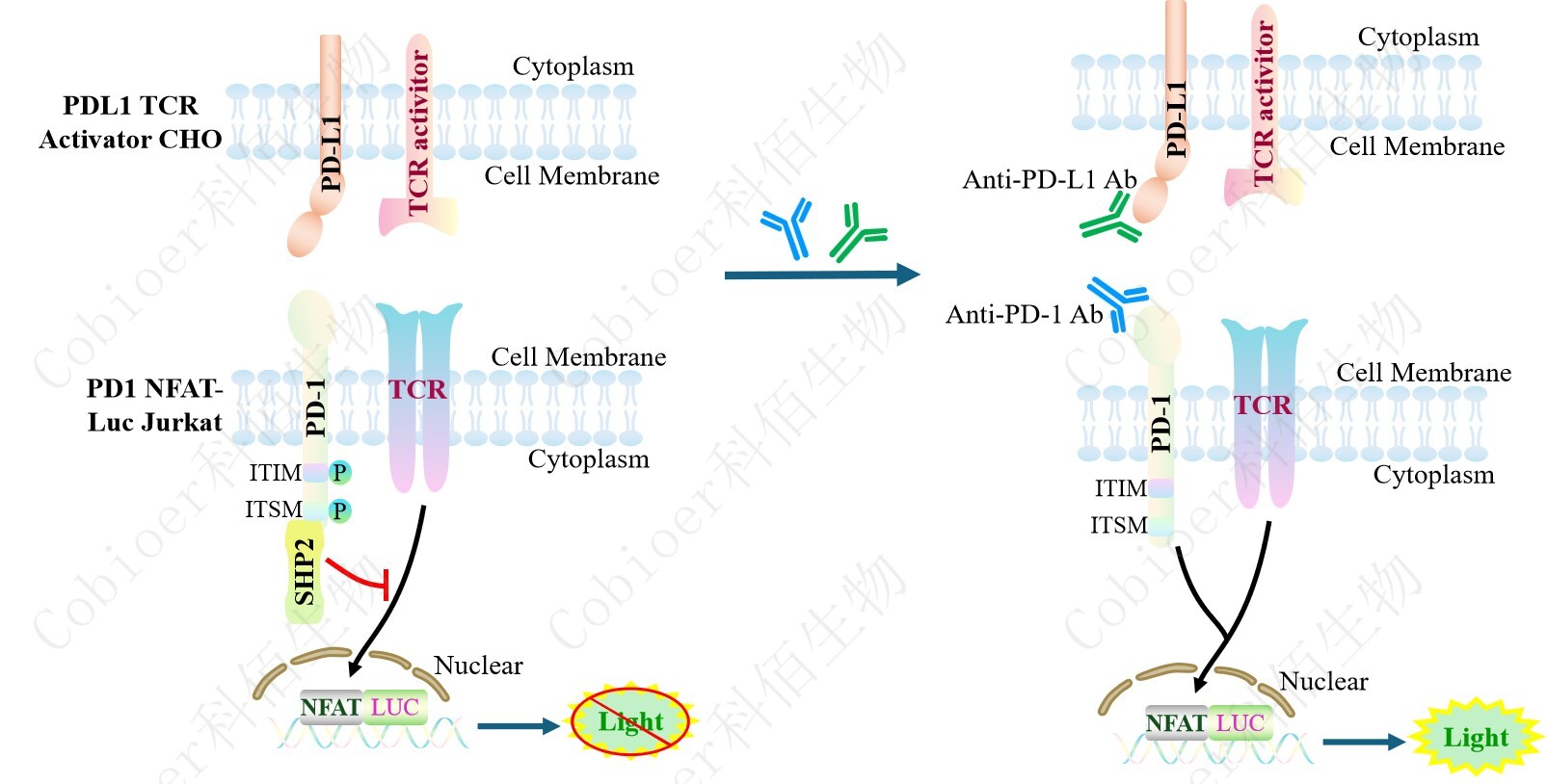PDL1 TCR Activator CHO 細胞作為 PD1 NFAT-Luc Jurkat 細胞的靶細胞,很好的模擬了 體內 PD1&PDL1 的信號轉導過程,原理見下圖所示。