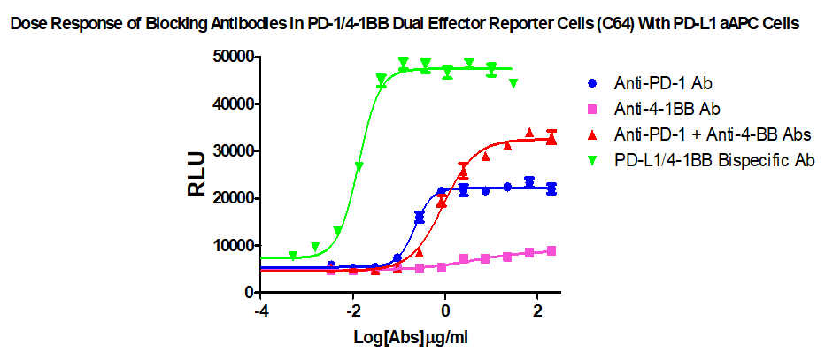 Figure 2.Dose Response of Blocking Antibodies in PD-1/41BB Dual Effector Reporter Cells (C64) With PD-L1 aAPC Cells.