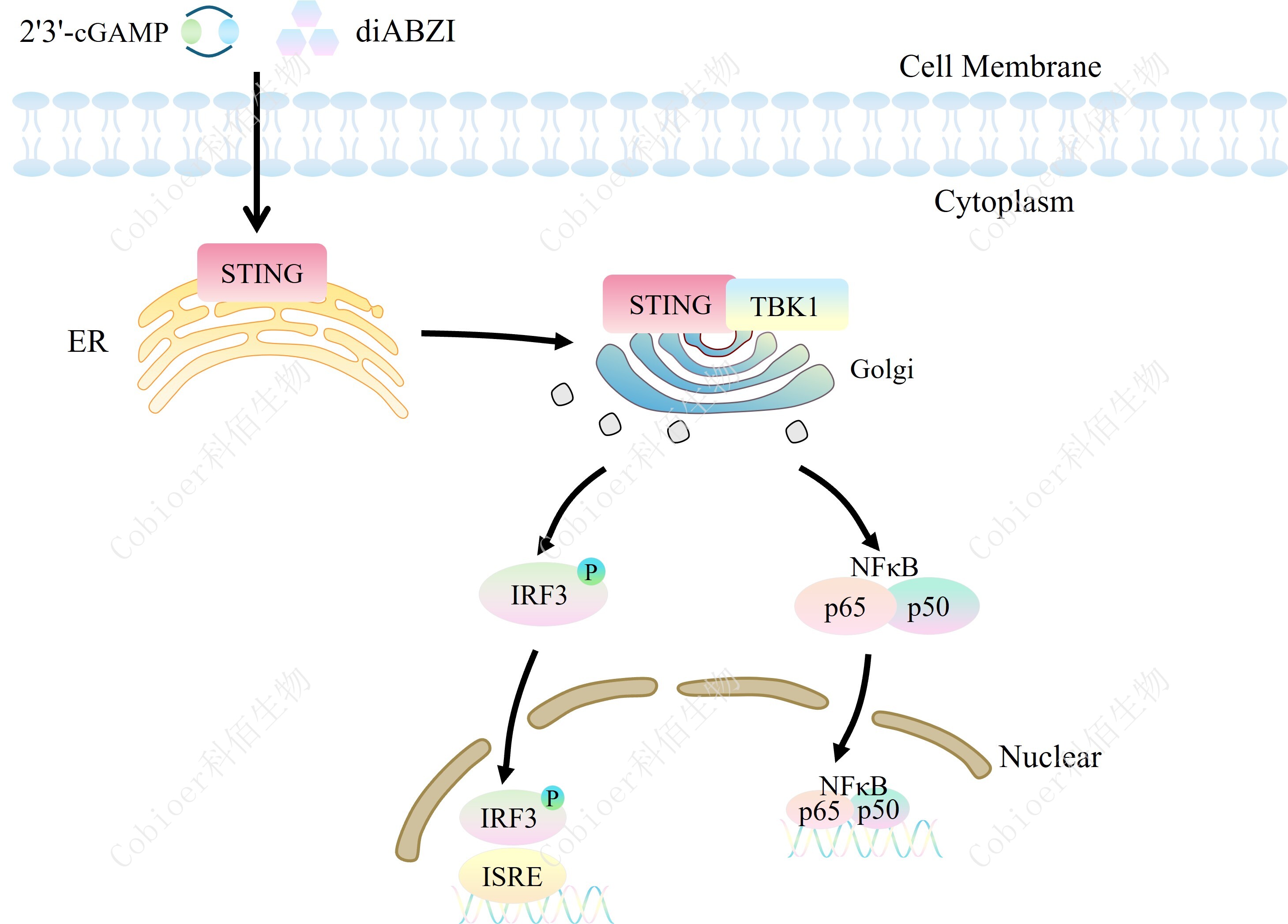 | STING(干擾素基因刺激因子)又稱 MPYS、TMEM173、MITA 和 ERIS,是一種跨膜蛋白,是環(huán)狀二核苷酸(CDN)的直接傳感器。CDN 是細菌信號轉(zhuǎn)導(dǎo)中普遍存在的第二信使分子,是哺乳動物細胞的防御觸發(fā)器。當細菌病原體攻擊時,釋放到細胞中的 CDN 直接與 STING 結(jié)合,激活的 STING 和 TANK 結(jié)合激酶-I (TBK1) 相互作用以誘導(dǎo)活性干擾素調(diào)節(jié)因子 (IRF3) 二聚體,然后該二聚體與細胞核中的干擾素刺激反應(yīng)元件 (ISRE) 結(jié)合并導(dǎo)致 IFN-α/β 的產(chǎn)生。IFNβ 的產(chǎn)生是 STING 活化的標志。腫瘤微環(huán)境(TME)中由于天然免疫產(chǎn)生的信號傳導(dǎo)是導(dǎo)致腫瘤特異性 T 細胞激活和腫瘤浸潤性淋巴細胞(TIL)浸潤的關(guān)鍵因素。其中尤其以 I 型 IFN 對腫瘤特異性 T 細胞的活化最為關(guān)鍵。因此,STING 激動劑可以通過誘導(dǎo)Ⅰ型干擾素基因的表達,激活包括樹突狀細胞等免疫刺激細胞,改變腫瘤微環(huán)境并誘導(dǎo)腫瘤特異性 T 細胞的產(chǎn)生,從而通過調(diào)節(jié)免疫系統(tǒng)達到抗腫瘤的目的。 | |