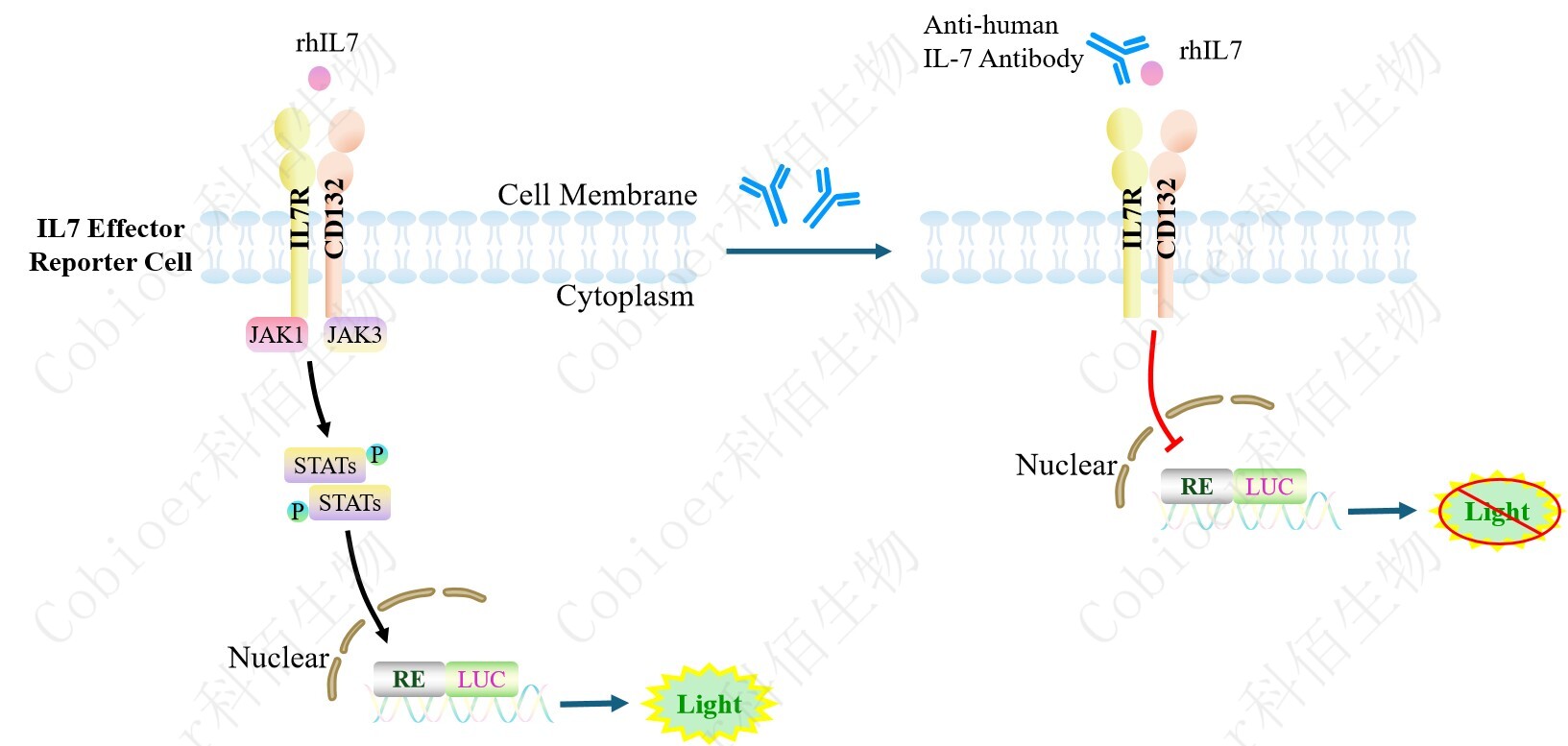 IL7 Effector Reporter Cell 報告基因藥靶模型很好的模擬了體內 IL7 的信號轉導過程,原理見下圖所示。![]() Figure 1. IL7 Effector Reporter Cell 模型原理圖 |