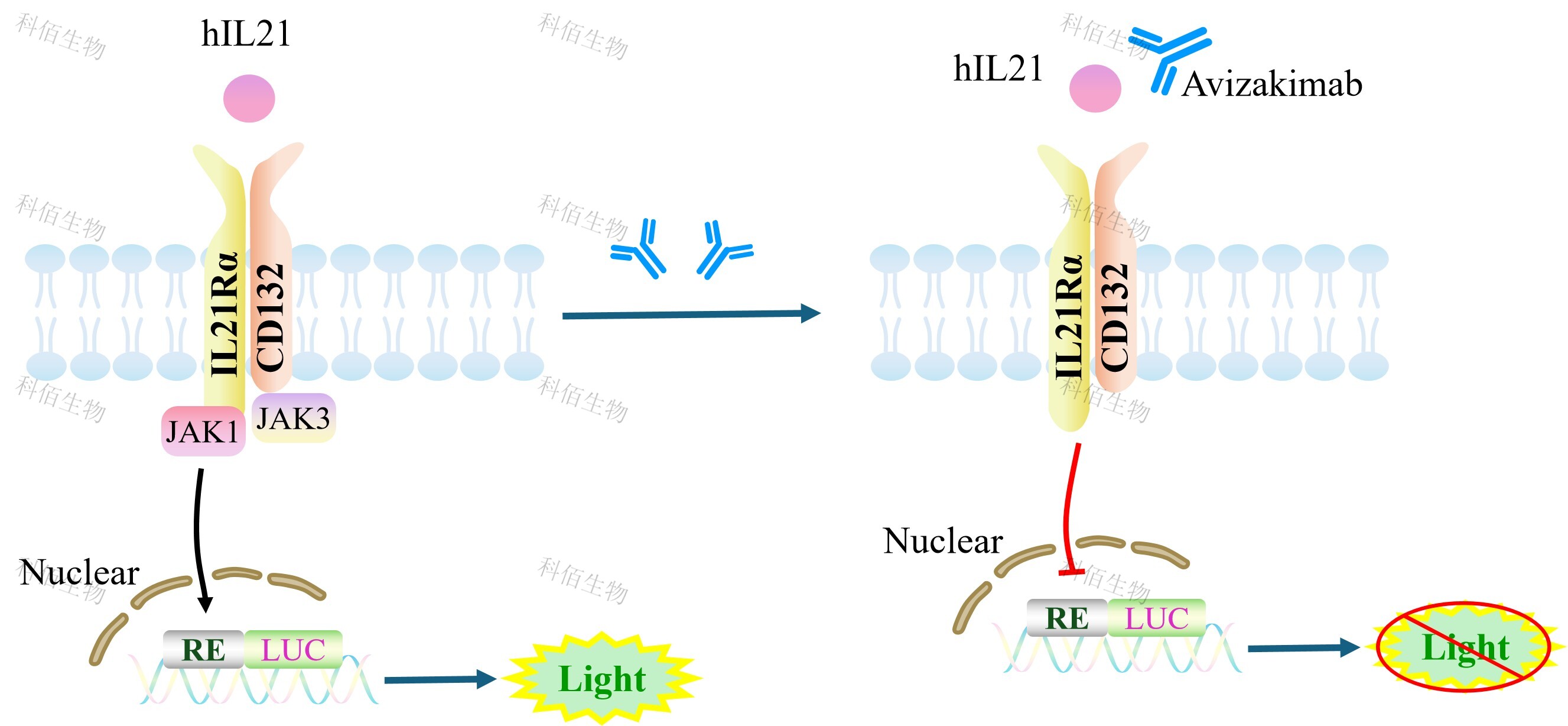 IL21 Effector Reporter Cell 報(bào)告基因藥靶模型很好的模擬了體內(nèi) IL21 的信號(hào)轉(zhuǎn)導(dǎo)過(guò)程, 原理見(jiàn)下圖所示。![]() Figure 1. IL21 Effector Reporter Cell 模型原理圖 |