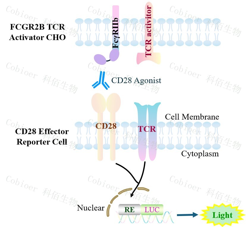 FCGR2B TCR Activator CHO,在基礎(chǔ)細(xì)胞上穩(wěn)定表達(dá) FcγRIIb 和 aAPC。 FCGR2B TCR Activator CHO 作為 CD28 Effector Reporter Cell 的靶細(xì)胞進(jìn)行功能檢測(cè),其原理圖見下圖所示。![]() Figure 1. FCGR2B TCR Activator CHO 的原理圖 |