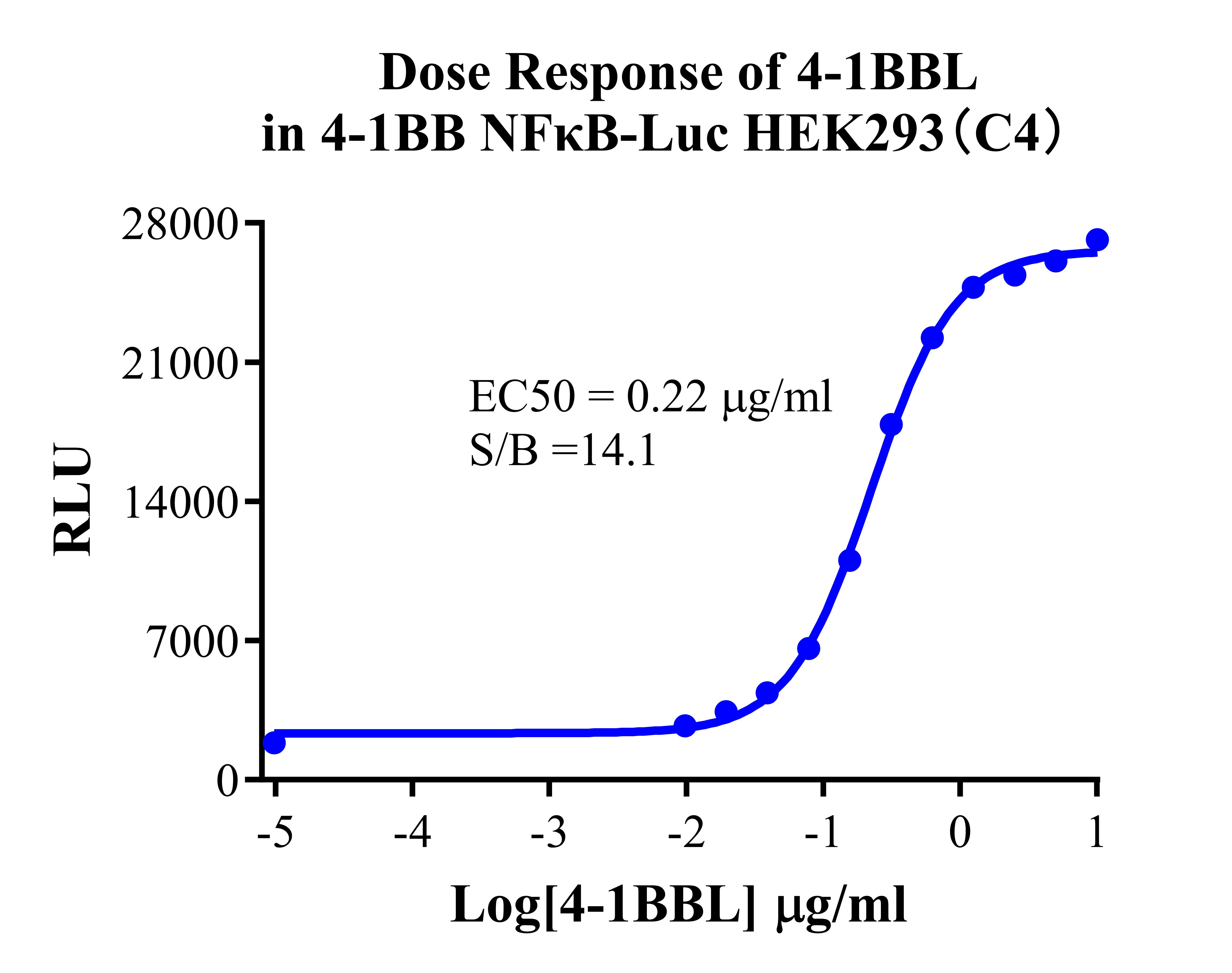 Figure 3. Detect Luciferase assay by Ultra Luciferase Detection Kit CBPH0001(we strongly suggest to purchase from Cobioer). Dose Response of 4-1BBL in 4-1BB NF-κB-Luc HEK293(C4). |