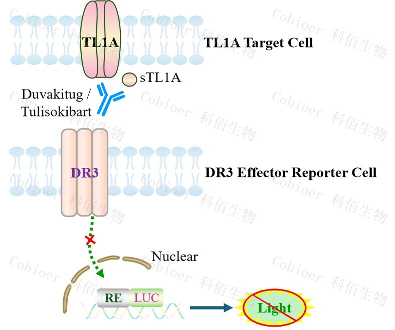 TL1A Target Cell 作為 DR3 Effector Reporter Cell 的靶細胞,很好的模擬了體內(nèi) DR3 的 信號轉(zhuǎn)導(dǎo)過程,原理見下圖所示。