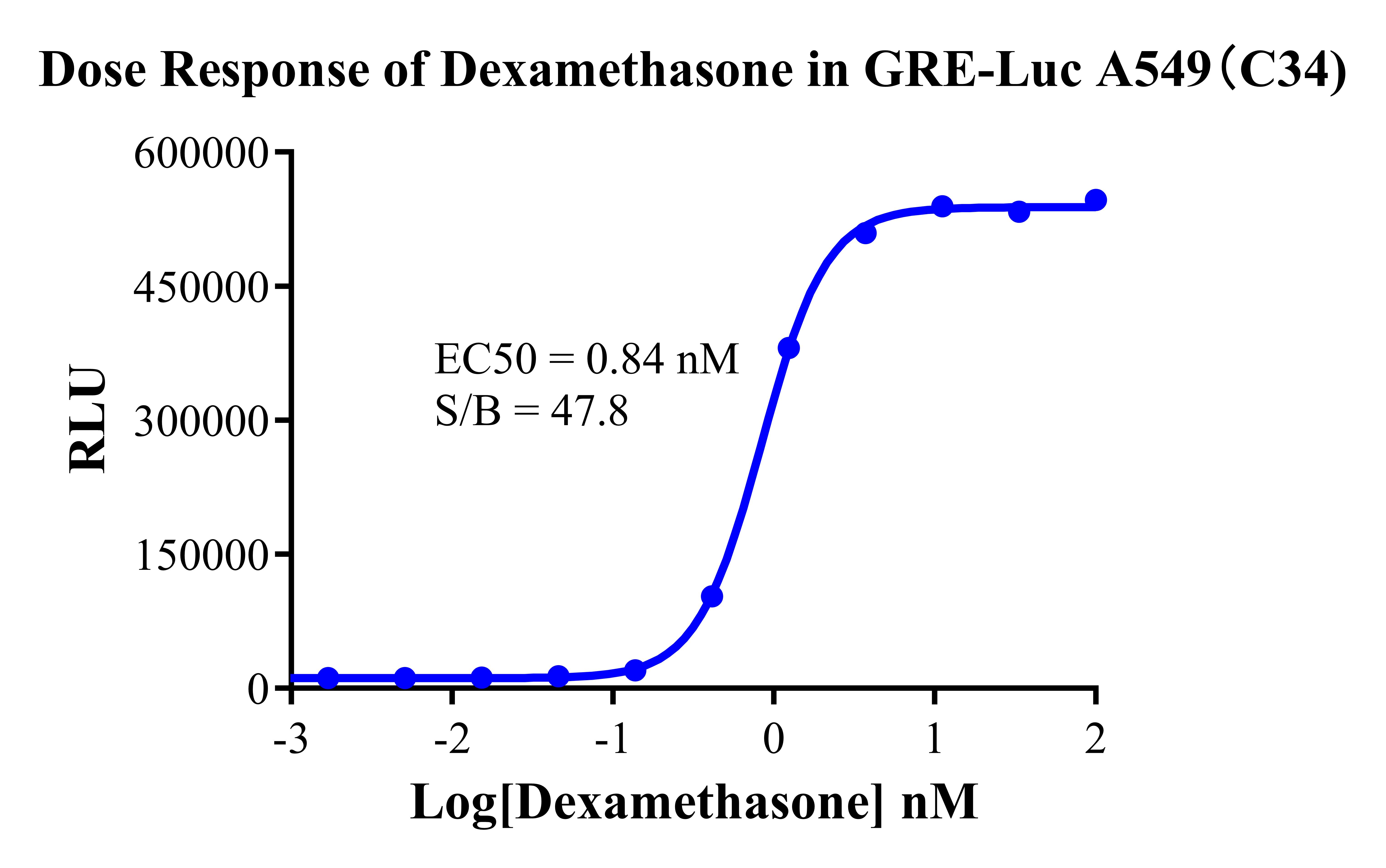 GRE-Luc A549 報告基因細胞,是由 GRE 調(diào)控并表達 Luc 熒光素酶報告 基 因的 A549 細 胞。 Dexamethasone (Hexadecadrol, 地 塞米 松)是 糖皮質(zhì)激素受體 (Glucocorticoid Receptor)激動劑、凋亡誘導劑,原理見下圖所示。![]() Figure 1. GRE-Luc A549 細胞原理示意圖 |