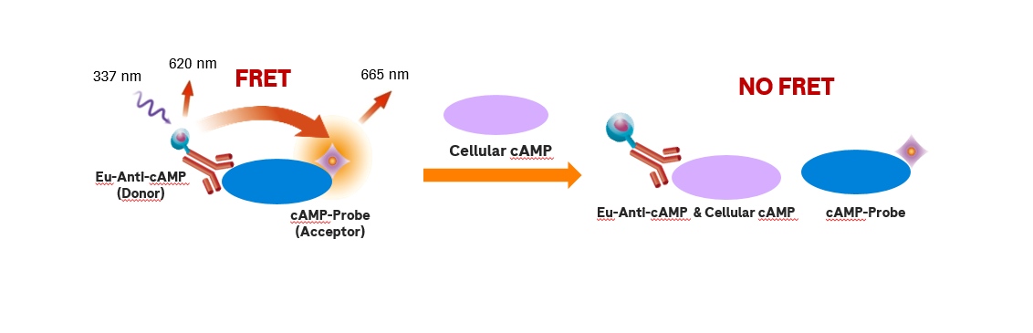 Cellular cyclic AMP Detection KIT是一種競(jìng)爭(zhēng)性的檢測(cè)技術(shù),檢測(cè)細(xì)胞內(nèi)cAMP的量。藥物同貼壁細(xì)胞或者懸浮細(xì)胞共處理后,能通過(guò)此KIT檢測(cè)出藥物對(duì)細(xì)胞的作用。 檢測(cè)原理采用TR-FRET檢測(cè)技術(shù)。細(xì)胞內(nèi)天然的cAMP同cAMP-Probe競(jìng)爭(zhēng)性結(jié)合Eu -Anti-cAMP。最終檢測(cè)出來(lái)的信號(hào)與樣本中cAMP的濃度成反比。