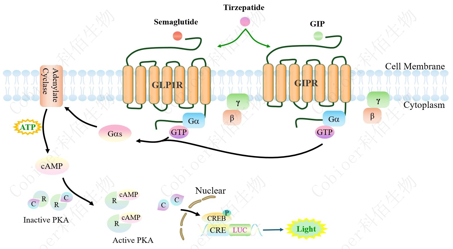GLP1R&GIPR Dual Reporter Cell 報告基因藥靶模型很好的模擬了體內(nèi) GLP1R&GIPR的信號轉(zhuǎn)導過程,原理見下圖所示。