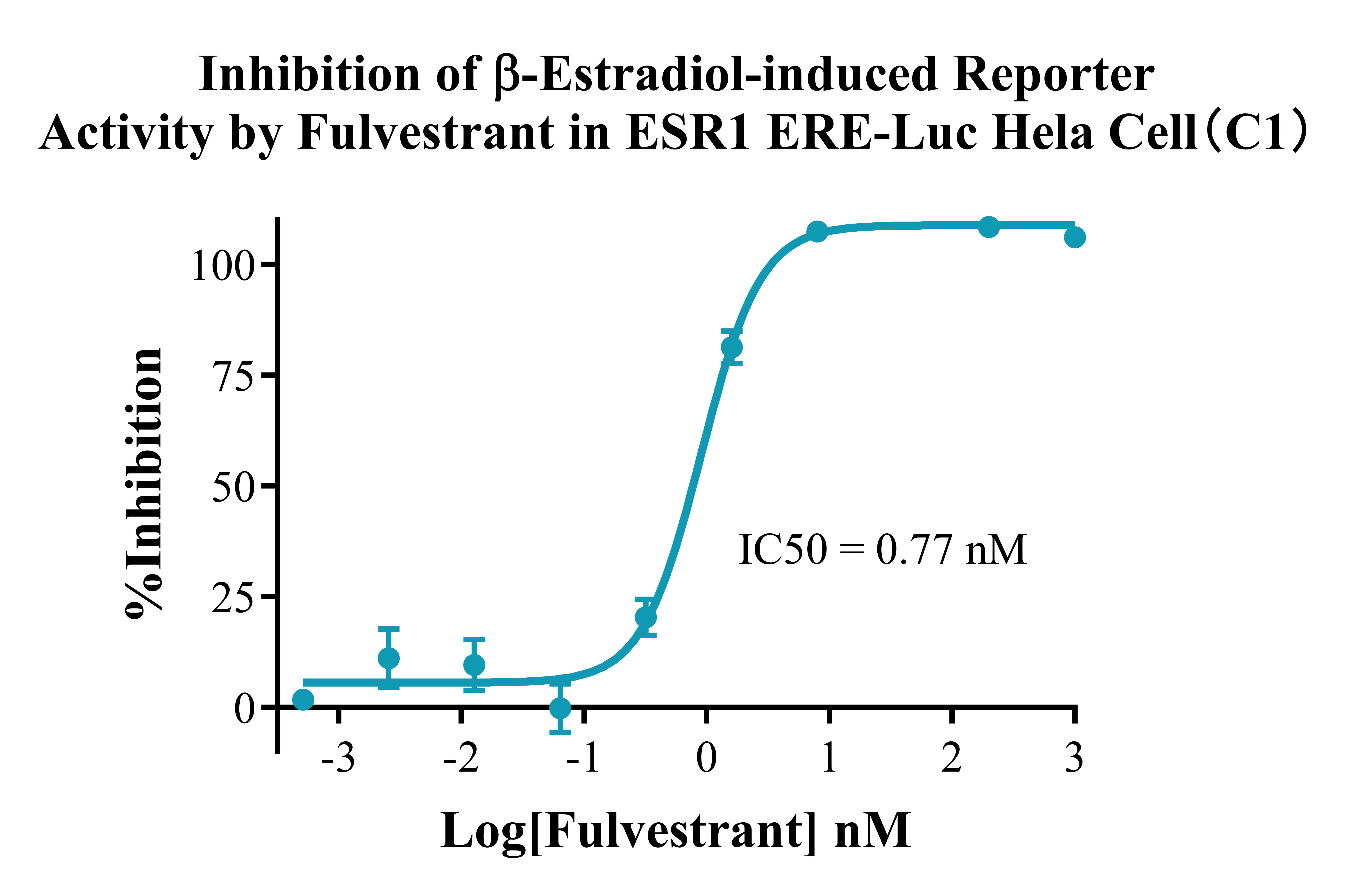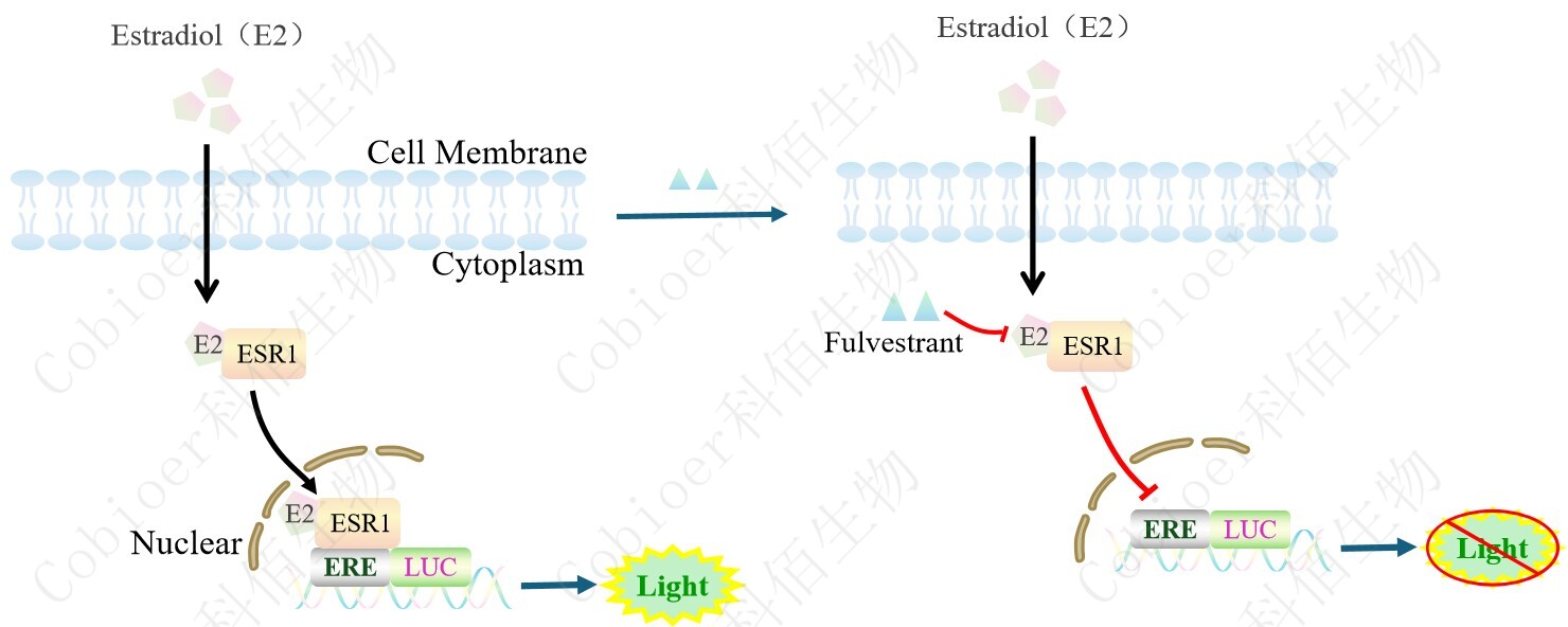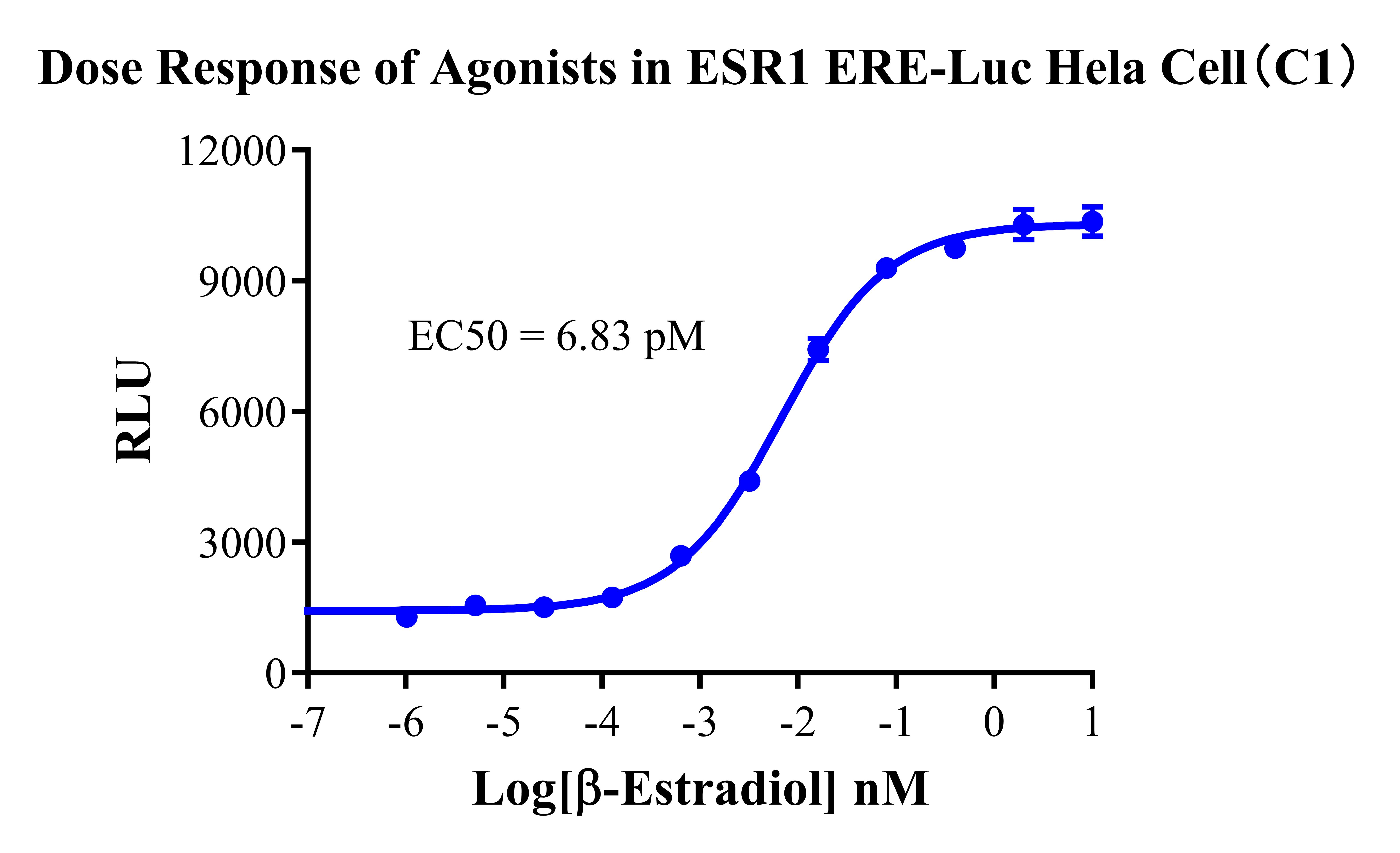 ESR1 ERE-Luc Hela Cell,是由 ERE 調(diào)控并表達(dá) Luc 熒光素酶報告基因 的 Hela 細(xì)胞。β-雌二醇(17β-Estradiol,E2)是人體內(nèi)活性最強(qiáng)的雌激素,主要通過結(jié)合 ER 發(fā)揮作用,調(diào)控基因表達(dá)和細(xì)胞功能,原理見下圖所示。![]() Figure 1. ESR1 ERE-Luc Hela Cell 原理示意圖 |