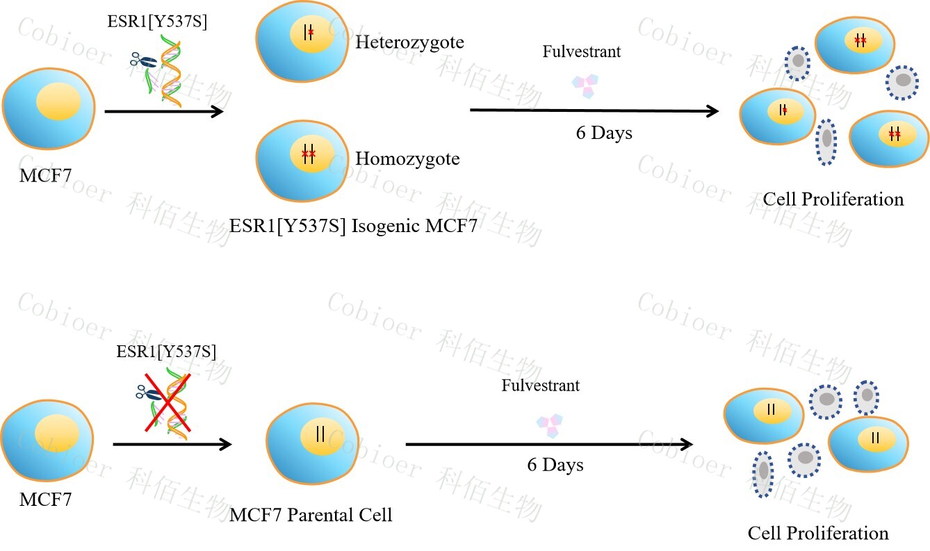 ESR1[Y537S] Isogenic MCF7 藥靶細胞,通過基因編輯的方式將 ESR1 的 537 位氨基酸酪氨酸(Y)突變?yōu)榻z氨酸(S)。![]() Figure 1. ESR1[Y537S] Isogenic MCF7 原理示意圖 |
