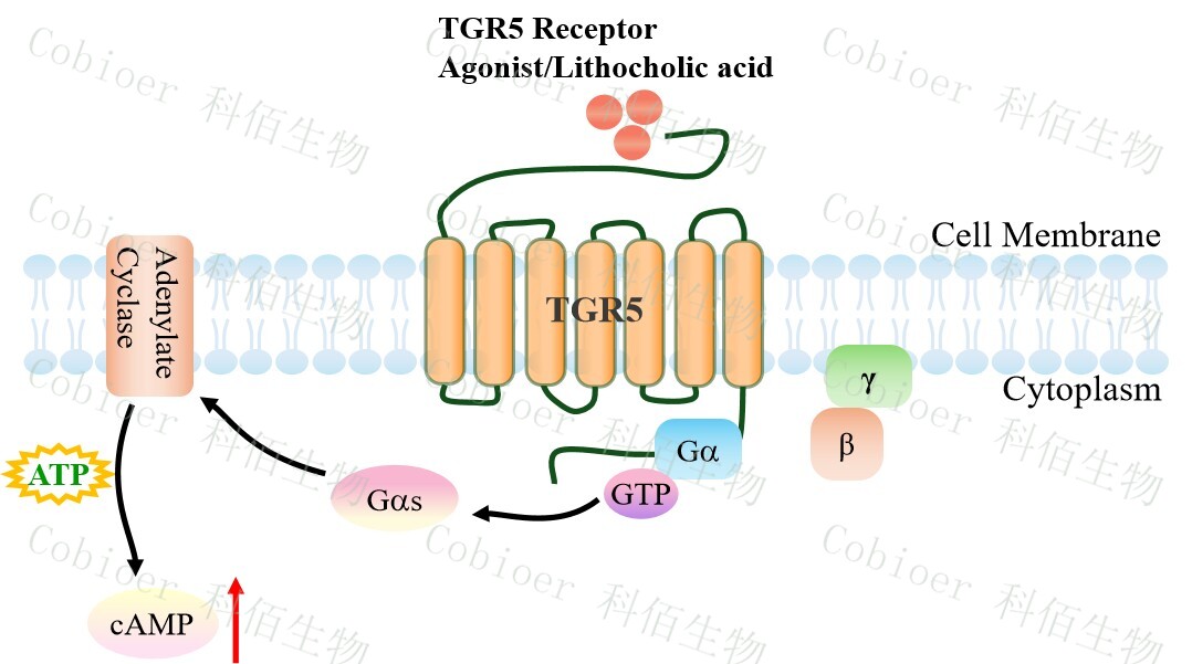 | TGR5 受體是第一個(gè)已知的膽汁酸特異性 G 蛋白偶聯(lián)受體,也被稱為膽汁酸受體 1(GPBAR1),屬于 A 類 GPCR 亞家族。該受體由七個(gè)跨膜螺旋(TMH1-7)、三個(gè)胞外環(huán) (ECL1-3)組成,有助于配體結(jié)合,以及三個(gè)胞內(nèi)環(huán)(ICL1-3),參與將信號(hào)傳遞給下游 信號(hào)分子。TGR5 在體內(nèi)廣泛存在,在膽囊、回腸、結(jié)腸、棕色脂肪組織、脾臟、肺、骨 骼肌、胰島,肝臟中均有表達(dá)。有文獻(xiàn)報(bào)道 TGR5 被認(rèn)為是治療代謝性疾?。ㄈ?2 型糖尿 ?。┑臐撛诎悬c(diǎn)。此外,TGR5 還能降低單核細(xì)胞中促炎細(xì)胞因子的水平,在炎癥過(guò)程 (包括結(jié)腸炎和動(dòng)脈粥樣硬化)中發(fā)揮核心作用的病理調(diào)節(jié)。 | |