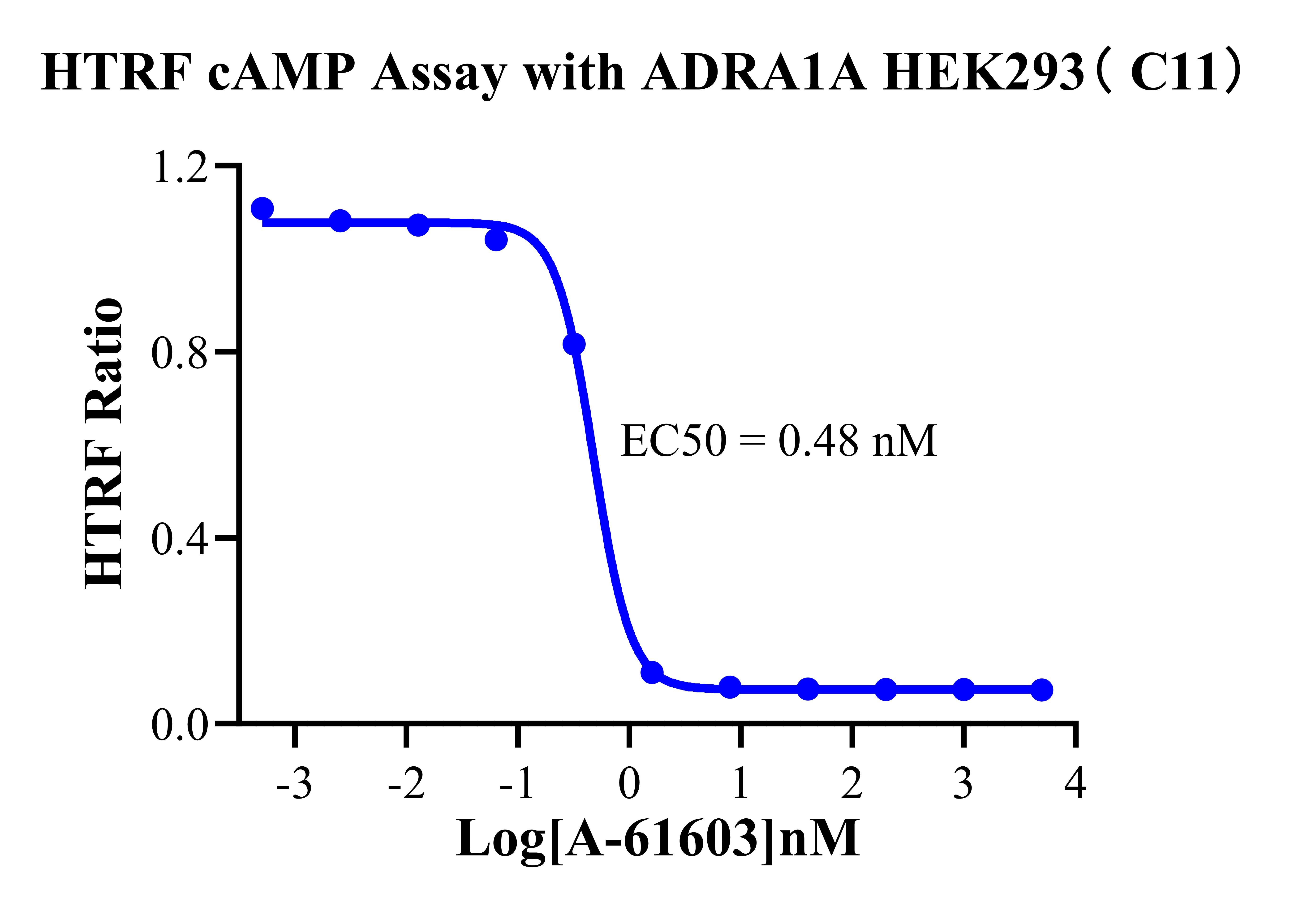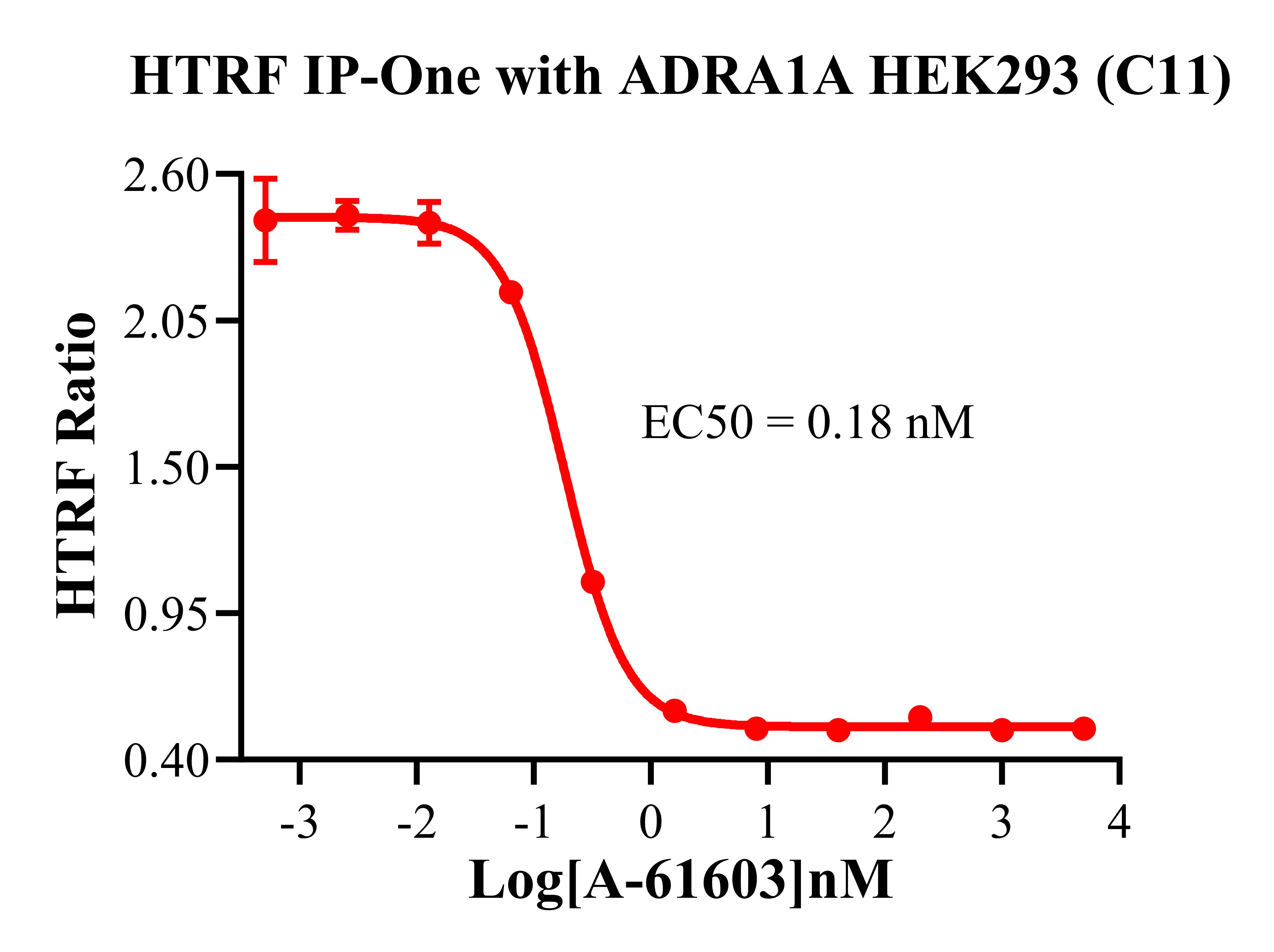 ADRA1A 還可以通過 Gq 蛋白的信號通路,調(diào)控 IP1 的升高。ADRA1A 與配體結(jié)合, 導(dǎo)致 Gαq 亞基的激活,觸發(fā) PLC-γ,從而產(chǎn)生兩個(gè)第二信使:IP3 和 DAG,它們參與細(xì)胞 內(nèi)鈣動員。由于 IP3 在代謝上不穩(wěn)定,因此測量通路激活的替代標(biāo)志物 IP1 作為檢測標(biāo)準(zhǔn)。