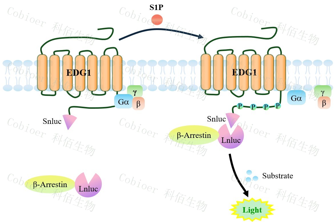 EDG1(S1P1) β-Arrestin CHO 報告基因藥靶模型很好的模擬了體內 EDG1(S1P1)/β- Arrestin 的信號轉導過程,原理見下圖所 示 。 當缺乏配體刺激時, β-Arrestin 不 與 EDG1(S1P1)結合,融合β-Arrestin 的熒光素酶處于失活構象,當 EDG1(S1P1)遭遇配體刺激 時,融合熒光素酶報告基因的β-Arrestin 被招募,使熒光素酶報告基因處于激活狀態(tài),加入 其底物后發(fā)光信號增強。![]() Figure 1. EDG1(S1P1) β-Arrestin CHO 細胞模型原理圖 |