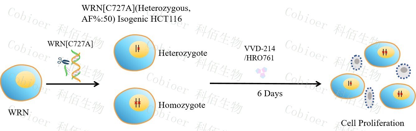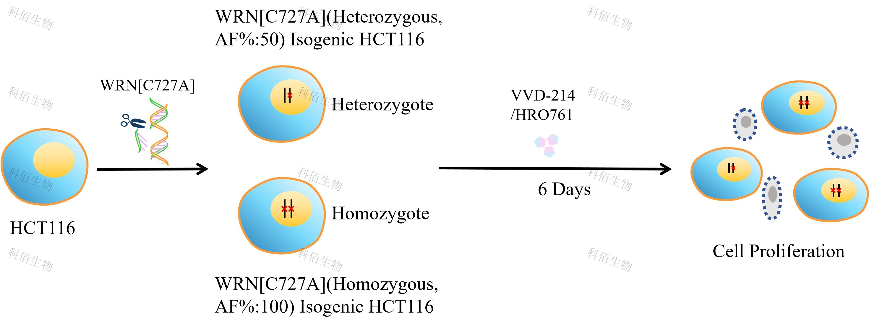 WRN[C727A](Heterozygous,AF%:50) Isogenic HCT116 藥靶細(xì)胞,通過基 因編輯的方式將 WRN 的 727 位氨基酸胱氨酸(C)突變?yōu)楸彼幔ˋ)。![]() Figure 1. WRN[C727A](Heterozygous,AF%:50) Isogenic HCT116 原理示意圖 |