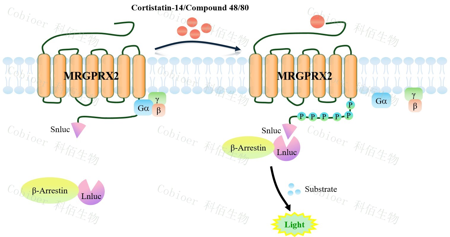 MRGPRX2 β-Arrestin CHO 報告基因藥靶模型很好的模擬了體內(nèi) MRGPRX2/β-Arrestin 的信號轉(zhuǎn)導(dǎo)過程,原理見下圖所示。當缺乏配體刺激時,β-Arrestin 不與 MRGPRX2 結(jié)合, 融合β-Arrestin 的熒光素酶處于失活構(gòu)象;當 MRGPRX2 遭遇配體刺激時,融合熒光素酶報 告基因的β-Arrestin 被招募,使熒光素酶報告基因處于激活狀態(tài),加入其底物后發(fā)光信號增 強。![]() Figure 1. MRGPRX2 β-Arrestin CHO 細胞模型原理圖 |