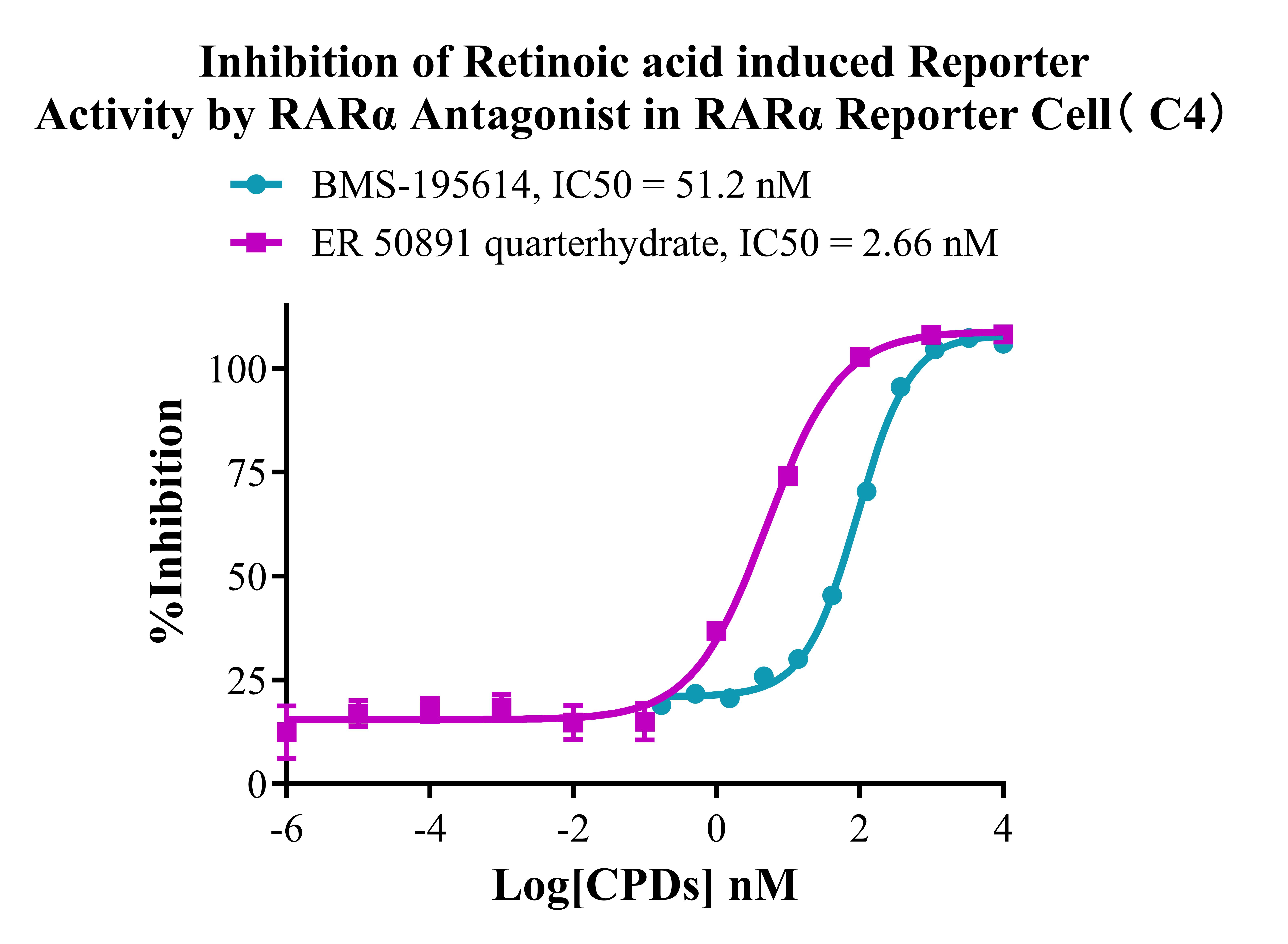 RARα Reporter Cell 報(bào)告基因細(xì)胞,在由調(diào)控因子調(diào)控并表達(dá)報(bào)告基因的重組細(xì)胞上,穩(wěn)定表達(dá)人 RARα。Retinoic acid 是 RAR 核受體的天然激動(dòng)劑,原理見下圖所示。![]() Figure 1. RARα Reporter Cell 細(xì)胞原理示意圖 |