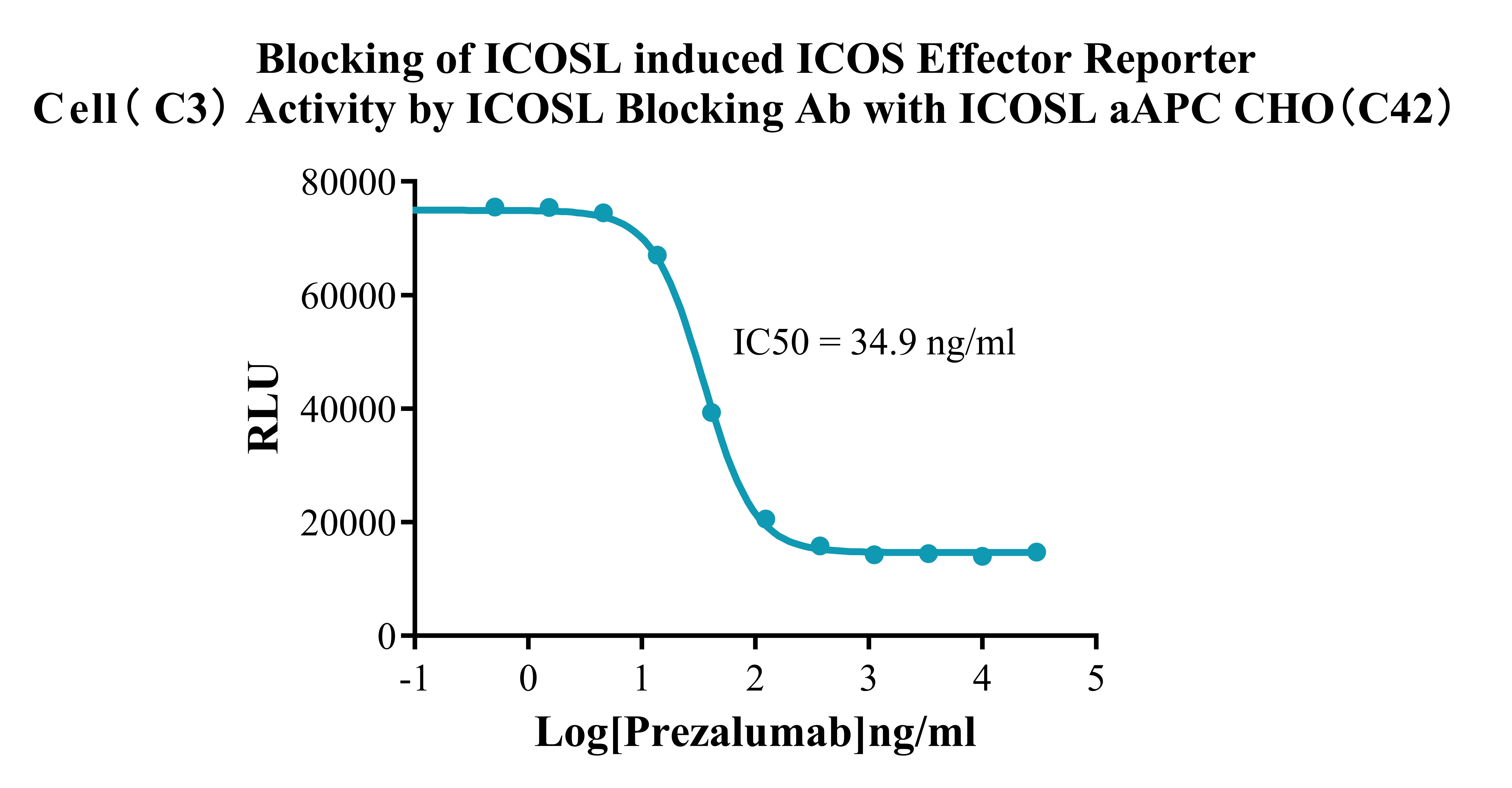 ![]() Figure 4. Blocking of ICOSL induced ICOS Effector Reporter Cell(C3) Activity by ICOSL Blocking Ab with ICOSL aAPC CHO(C42). |