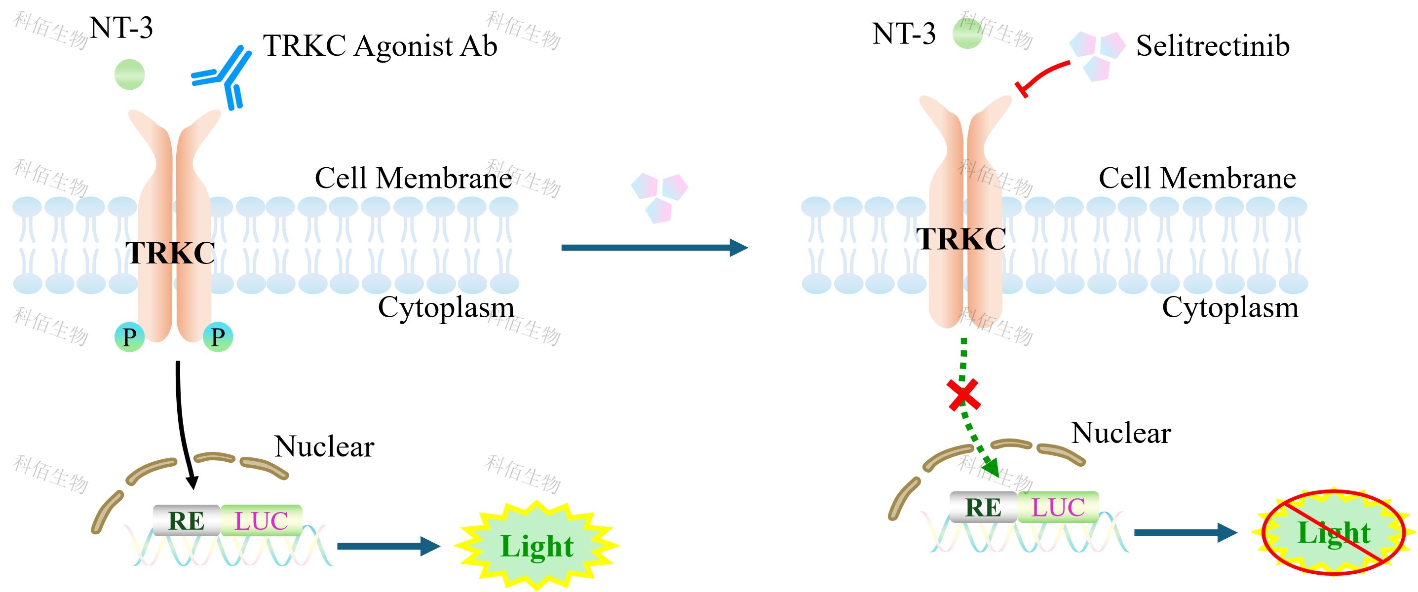 TRKC Effector Reporter Cell 報告基因藥靶模型很好的模擬了體內(nèi) TRKC 的信號轉(zhuǎn)導過程,原理見下圖所示。![]() Figure 1. TRKC Effector Reporter Cell 模型原理圖 |