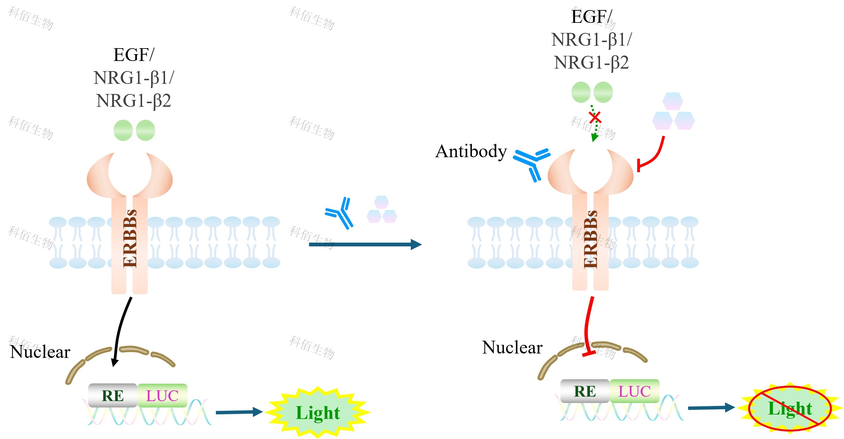 ERBB Family Effector Reporter Cell 報(bào)告基因藥靶模型很好的模擬了體內(nèi) ERBB 家族的信號(hào)轉(zhuǎn)導(dǎo)過程,原理見下圖所示。![]() Figure 1. ERBB Family Effector Reporter Cell 細(xì)胞模型原理圖 |