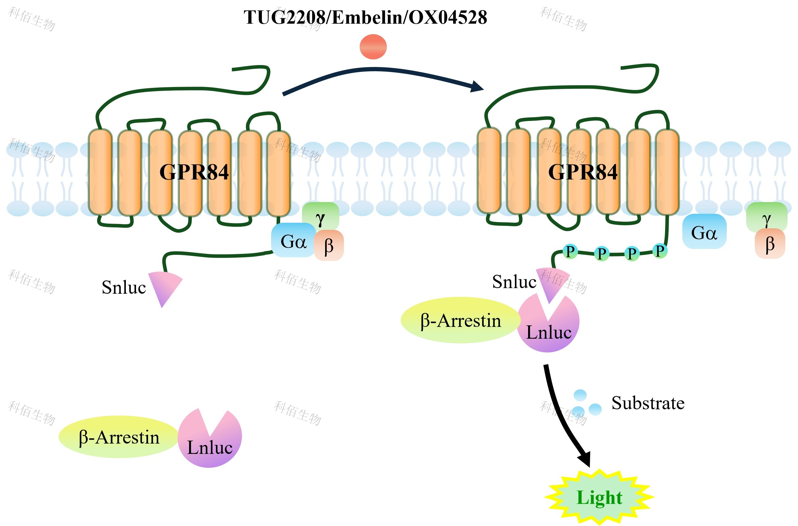 GPR84 β-Arrestin CHO 報告基因藥靶模型很好的模擬了體內(nèi) GPR84/β-Arrestin 的信號轉(zhuǎn)導(dǎo)過程,原理見下圖所示。當(dāng)缺乏配體刺激時,β-Arrestin 不與 GPR84 結(jié)合,融合β- Arrestin 的熒光素酶處于失活構(gòu)象,當(dāng) GPR84 遭遇配體刺激時,融合熒光素酶報告基因的 β-Arrestin 被招募,使熒光素酶報告基因處于激活狀態(tài),加入其底物后發(fā)光信號增強。![]() Figure 1. GPR84 β-Arrestin CHO 細胞模型原理圖 |