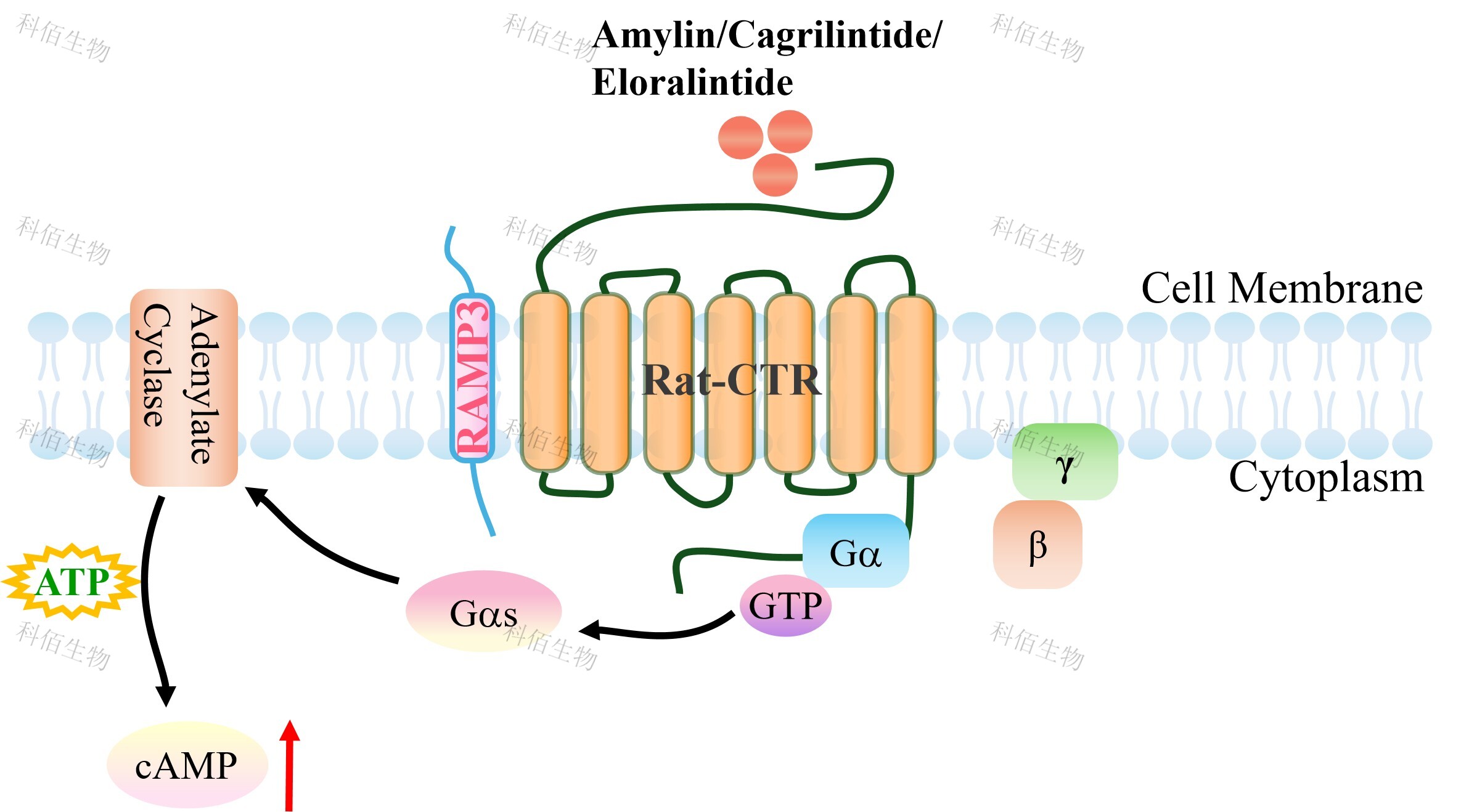 | 降鈣素基因相關(guān)肽(CGRP)家族包括 CGRP 本身、降鈣素(CT)、腎上腺髓質(zhì)素 (AM)和胰島淀粉樣肽(AMY)。 胰淀素(Amylin)受體的三種類(lèi)型的已被確定,即 AMY1,AMY2 和 AMY3。 胰淀素受體屬于 B 類(lèi) GPCR,是異二聚體復(fù)合物,由降鈣素受體(CTR)與受體活性修飾蛋白 (RAMPs)結(jié)合形成。該受體的 CTR 組分具有相同的 GPCR 結(jié)構(gòu):7 個(gè)跨膜相互連接的α- 螺旋,將細(xì)胞外信號(hào)傳遞到細(xì)胞內(nèi)細(xì)胞質(zhì)信號(hào)級(jí)聯(lián)。RAMP 有三種類(lèi)型(RAMP1、 RAMP2 和 RAMP3),它們共享 31%的氨基酸序列,具有相似的基本結(jié)構(gòu)。RAMP 是將 CTR 轉(zhuǎn)運(yùn)到細(xì)胞膜并調(diào)節(jié)其配體特異性的重要肽,它可以改變特定 GPCR 的藥理學(xué)、功能和細(xì)胞運(yùn)輸。 哺乳動(dòng)物細(xì)胞中 Amylin 受體的激活已被證明可以提高 cAMP,并被認(rèn)為與 Gs 蛋白和腺苷酸環(huán)化酶的刺激有關(guān)。在 RAMPs 的存在下,其與胰淀素的結(jié)合親和力可以被修飾。 CTR 和 RAMP1 或 CTR 和 RAMP3 的異質(zhì)結(jié)構(gòu)被認(rèn)為有利于與胰淀素結(jié)合,介導(dǎo)大腦中的生理功能。AMY3 的激活刺激 G 蛋白 Gαs,進(jìn)一步控制腺苷酸環(huán)化酶(AC),隨后增加細(xì) 胞 cAMP。cAMP 與 PKA 調(diào)控亞基(R2)的結(jié)合誘導(dǎo) PKA 四聚體全酶解離,導(dǎo)致 PKA 催化亞基的激活。cAMP 激活的 PKA 參與調(diào)控 ERK1/2 的活性。ERK1/2 通路的觸發(fā)可能導(dǎo)致 Ca 2+分布不均勻,引發(fā)內(nèi)質(zhì)網(wǎng)和線粒體功能障礙,導(dǎo)致細(xì)胞死亡。此外,cAMP 刺激 AKT 進(jìn)一步導(dǎo)致轉(zhuǎn)錄因子 cFos 的表達(dá)。 |