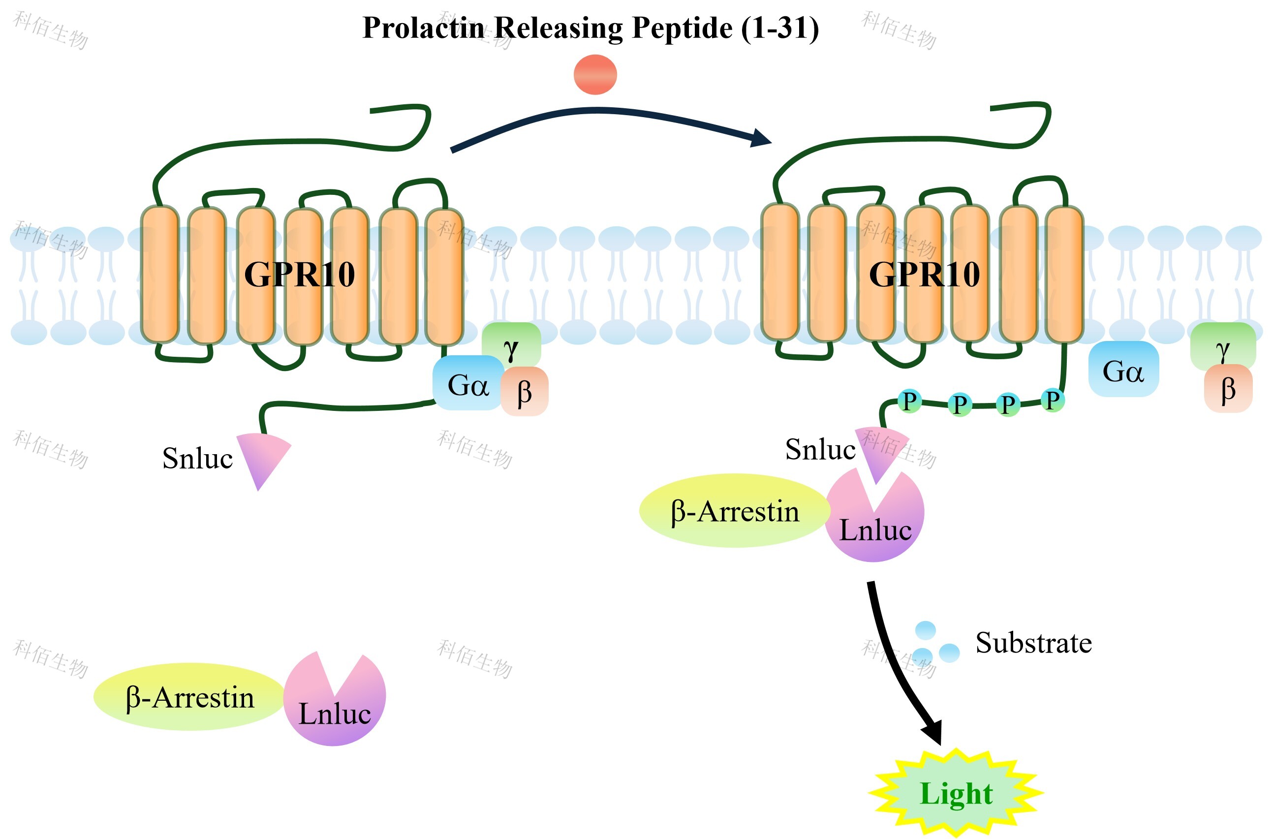GPR10 β-Arrestin CHO 報告基因藥靶模型很好的模擬了體內(nèi) GPR10/β-Arrestin 的信號轉(zhuǎn)導(dǎo)過程,原理見下圖所示。當(dāng)缺乏配體刺激時,β-Arrestin 不與 GPR10 結(jié)合,融合β- Arrestin 的熒光素酶處于失活構(gòu)象,當(dāng) GPR10 遭遇配體刺激時,融合熒光素酶報告基因的 β-Arrestin 被招募,使熒光素酶報告基因處于激活狀態(tài),加入其底物后發(fā)光信號增強。![]() Figure 1. GPR10 β-Arrestin CHO 細(xì)胞模型原理圖 |