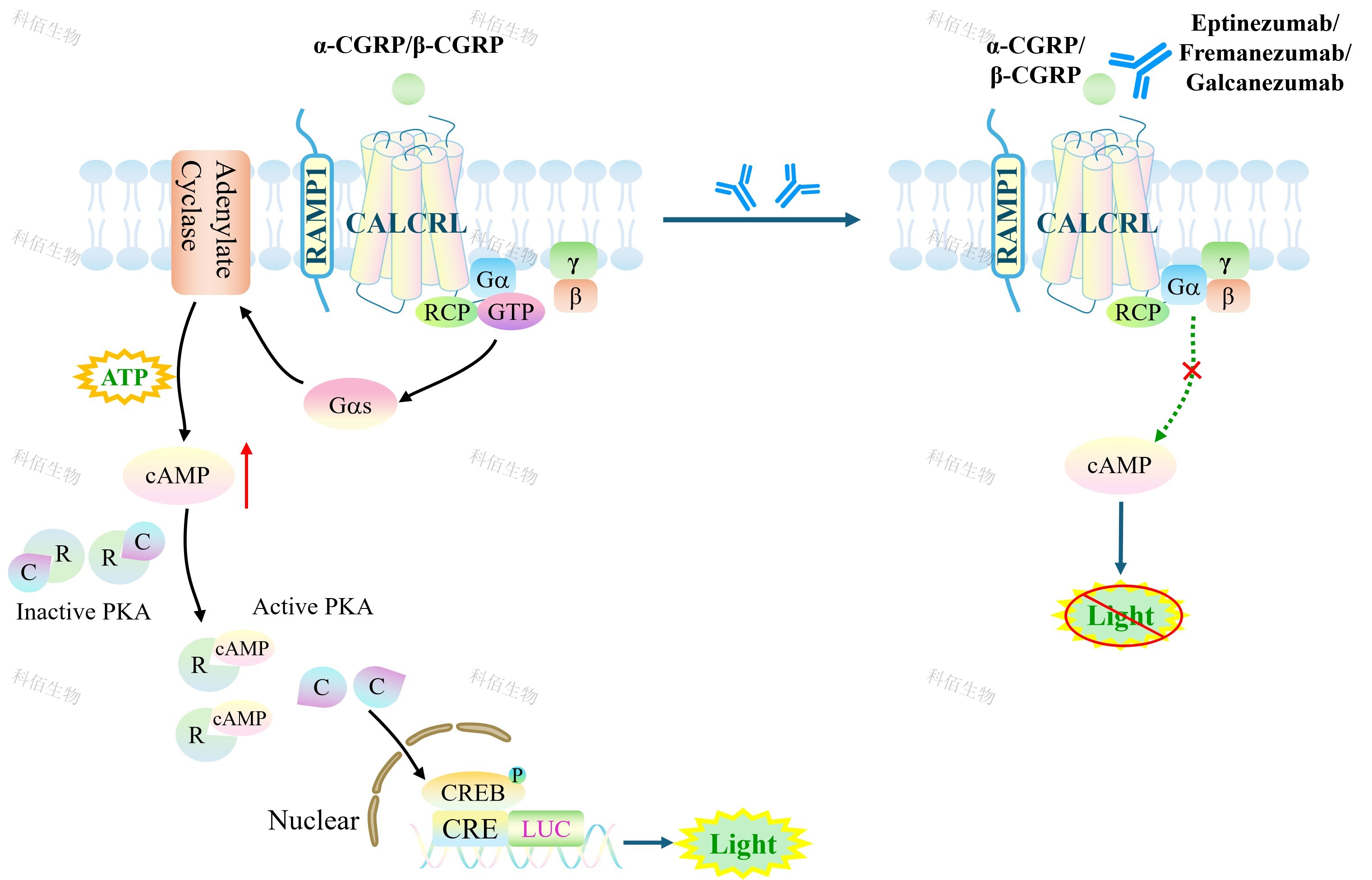 ![]() Figure 1. CALCRL&RAMP1 CRE-Luc HEK293 細(xì)胞模型原理圖 |