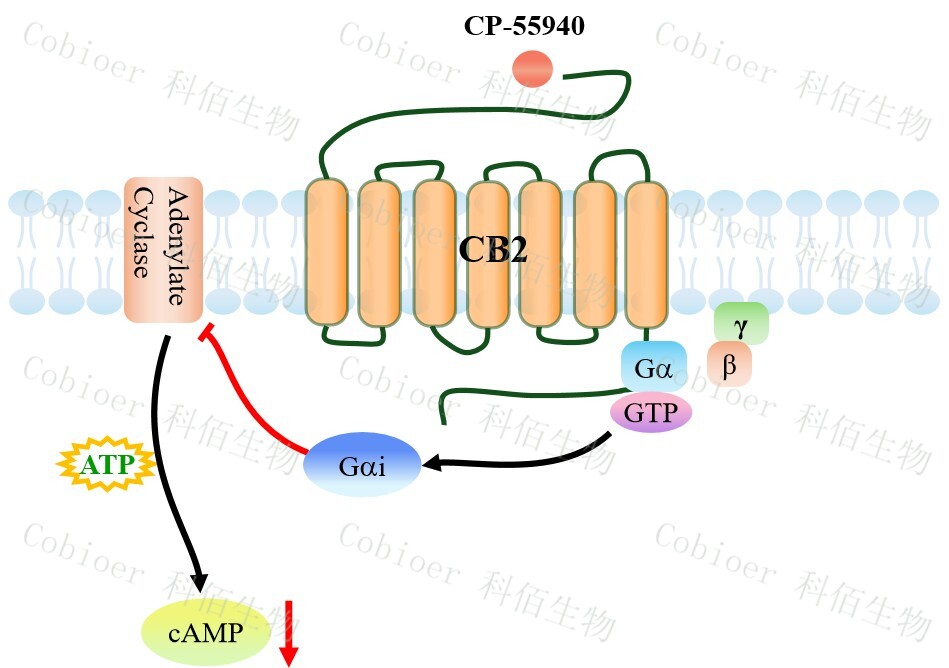 cAMP 在 G 蛋白偶聯(lián)受體(GPCR)信號轉(zhuǎn)導(dǎo)中是一種關(guān)鍵的第二信使。當(dāng)配體結(jié)合到 GPCR,構(gòu)象發(fā)生變化,激活受體接著激活 G 蛋白,Gi 的激活導(dǎo)致腺苷酸環(huán)化酶調(diào)控 cAMP 的下調(diào)。CB2 CHO 藥靶模型很好的模擬了體內(nèi) CB2 的信號轉(zhuǎn)導(dǎo)過程,原理見下圖所示。![]() Figure 1. CB2 CHO 細(xì)胞模型原理圖 |