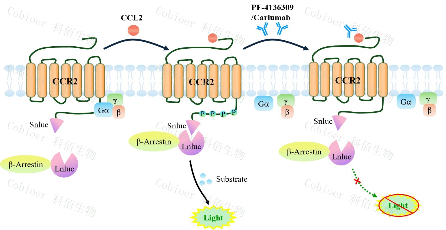 CCR2 β-Arrestin CHO 報告基因藥靶模型很好的模擬了體內(nèi) CCR2/β-Arrestin 的信號轉(zhuǎn) 導(dǎo)過程,原理見下圖所示。當(dāng)缺乏配體刺激時,β-Arrestin 不與 CCR2 結(jié)合,融合β-Arrestin 的熒光素酶處于失活構(gòu)象,當(dāng) CCR2 遭遇配體刺激時,融合熒光素酶報告基因的β-Arrestin 被招募,使熒光素酶報告基因處于激活狀態(tài),加入其底物后發(fā)光信號增強。![]() Figure 1. CCR2 β-Arrestin CHO 細胞模型原理圖 |