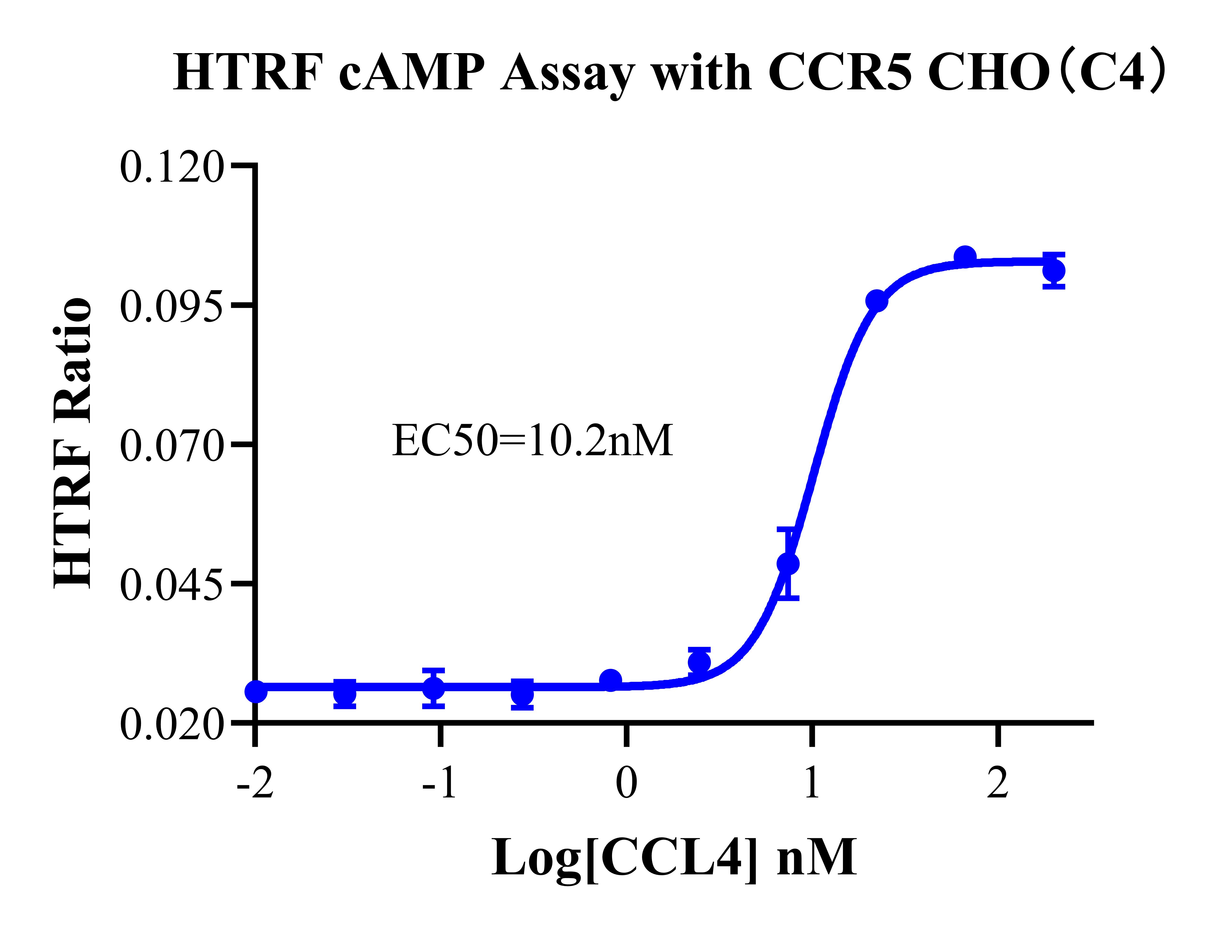 cAMP 在 G 蛋白偶聯(lián)受體(GPCR)信號轉(zhuǎn)導中是一種關(guān)鍵的第二信使。當配體結(jié)合到 GPCR,構(gòu)象發(fā)生變化,激活受體接著激活G蛋白,Gi的激活導致腺苷酸環(huán)化酶調(diào)控 cAMP 的下調(diào)。CCR5 藥靶模型很好的模擬了體內(nèi) CCR5 的信號轉(zhuǎn)導過程,原理見下圖所示。![]() Figure 1. CCR5 CHO 細胞模型原理圖