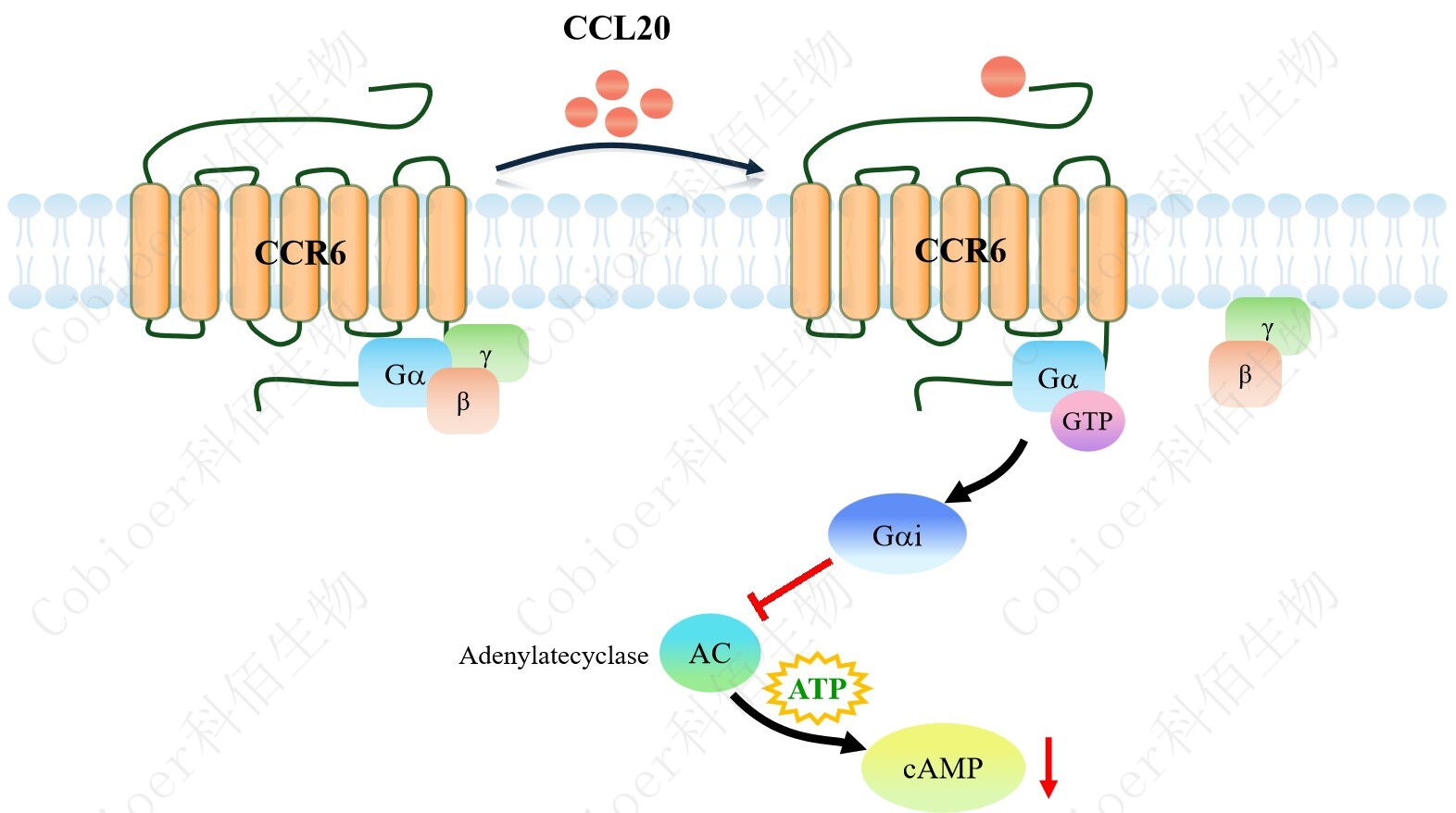cAMP 在 G 蛋白偶聯(lián)受體(GPCR)信號轉(zhuǎn)導中是一種關鍵的第二信使。當配體結合到 GPCR,構象發(fā)生變化,激活受體接著激活 G 蛋白,Gi 的激活導致腺苷酸環(huán)化酶調(diào)控 cAMP 的下調(diào)。CCR6 藥靶模型很好的模擬了體內(nèi) CCR6 的信號轉(zhuǎn)導過程,原理見下圖所示。![]() Figure 1. CCR6 CHO 細胞模型原理圖 |