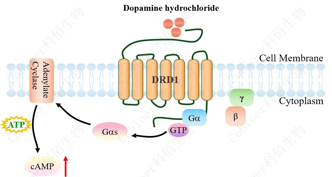 cAMP 在 G 蛋白偶聯(lián)受體(GPCR)信號轉(zhuǎn)導(dǎo)中是一種關(guān)鍵的第二信使。當(dāng)配體結(jié)合 到 GPCR,構(gòu)象發(fā)生變化,激活受體接著激活 G 蛋白,Gs 的激活導(dǎo)致腺苷酸環(huán)化酶調(diào)控 cAMP 的升高。DRD1 CHO 藥靶模型很好的模擬了體內(nèi) DRD1 的信號轉(zhuǎn)導(dǎo)過程,原理見下圖所示。![]() Figure 1. DRD1 CHO 細(xì)胞模型原理 |