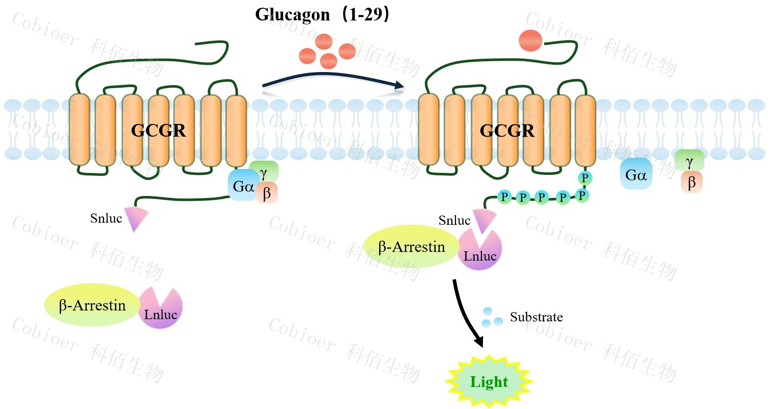 GCGR β-Arrestin CHO 報告基因藥靶模型很好的模擬了體內(nèi) GCGR/β-Arrestin 的信號轉(zhuǎn) 導(dǎo)過程,原理見下圖所示。當(dāng)缺乏配體刺激時,β-Arrestin 不與 GCGR 結(jié)合,融合β- Arrestin 的熒光素酶處于失活構(gòu)象;當(dāng) GCGR 遭遇配體刺激時,融合熒光素酶報告基因的β- Arrestin 被招募,使熒光素酶報告基因處于激活狀態(tài),加入其底物后發(fā)光信號增強(qiáng)。![]() Figure 1. GCGR β-Arrestin CHO 細(xì)胞模型原理圖 |