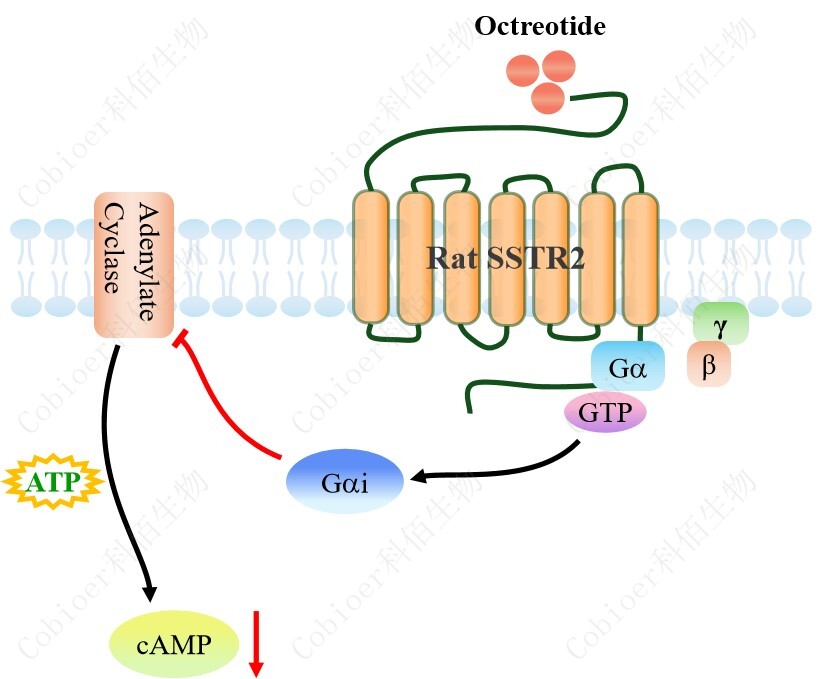 | 生長抑素受體(Somatostatin receptor,SSTRs)是 GPCR 超家族中的 class A 家族的成 員,共有 5 種亞型,分別為 SSTR1-SSTR5,其中 SSTR2 是唯一一種有 SSTR2a 和 SSTR2b 這 2 種異構體的 SSTR 亞型受體蛋白。SSTR2 廣泛分布于正常組織中,如腦下垂體、胰島、 腎上腺、胸腺、胃腸道以及免疫系統(tǒng)等,在不同受體的組織,表達譜各不相同。 SSTR2 與其它同家族受體一樣,在結合內源性多肽配體 SST 后可以與 Gi 蛋白偶聯(lián), 通過調節(jié)腺苷酸環(huán)化酶活性進而抑制環(huán)腺苷酸的合成,將外源信號傳遞至胞內,從而參與 調節(jié)多種激素的分泌,抑制細胞生長增殖。SSTR 還能激活 K+通道,促進細胞膜超極化, 抑制門控 Ca 2+通道的激活,進而阻礙 Ca 2+ 內流,抑制胞吐,抑制荷爾蒙的分泌功能。當 SSTR2 或其它亞型與 SST 結合后,可以通過蛋白酪氨酸磷酸途徑,SSTR 導致蛋白酪氨酸 磷酸酶(PTP)上調,使酪氨酸激酶去磷酸化而失活,并抑制促絲裂原活化蛋白激酶 (MAPK)等多種蛋白激酶,抑制癌基因、c-fos、c-mys、c-jun 等轉錄激活,從而抑制 DNA 和蛋白質的合成。SSTR2 在神經母細胞瘤、垂體腺瘤、黑色素瘤、甲狀腺癌以及許多 神經內分泌腫瘤中高表達。 |