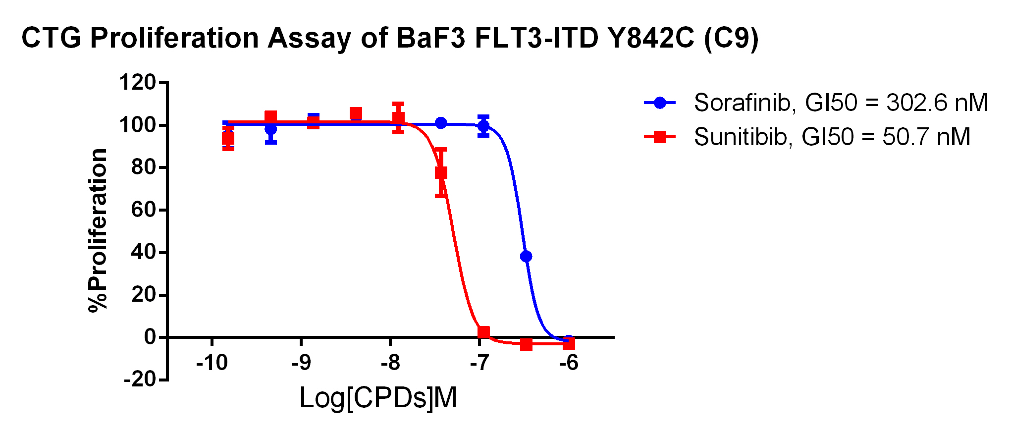 Figure 4. Anti-proliferation assay of two reference compounds on the FLT3-ITD [Y842C]/BaF3 Stable Cell Line. |