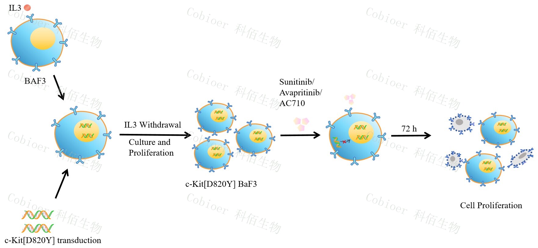 | c-Kit[D820Y] BaF3 藥靶細(xì)胞,通過(guò)轉(zhuǎn)導(dǎo)突變狀態(tài)的 c-Kit[D820Y] 基因 到 BaF3 細(xì)胞系中,穩(wěn)定表達(dá)人突變形態(tài)下的 c-Kit[D820Y] 基因。 BaF3(小鼠原 B 細(xì)胞)的生長(zhǎng)和增殖需要 IL-3 的維持。通過(guò)引入各種表達(dá)激酶的基因, 能作為 BaF3 的驅(qū)動(dòng)基因,讓 BaF3 不再依賴 IL-3 而增殖,進(jìn)而激酶基因成為 BaF3 增殖依賴的驅(qū)動(dòng)基因,用于評(píng)估小分子藥物對(duì)激酶的靶向抑制作用,原理及流程見(jiàn)下圖所示。 ![]() Figure 1. c-Kit [D820Y] BaF3 細(xì)胞的構(gòu)建原理圖 |