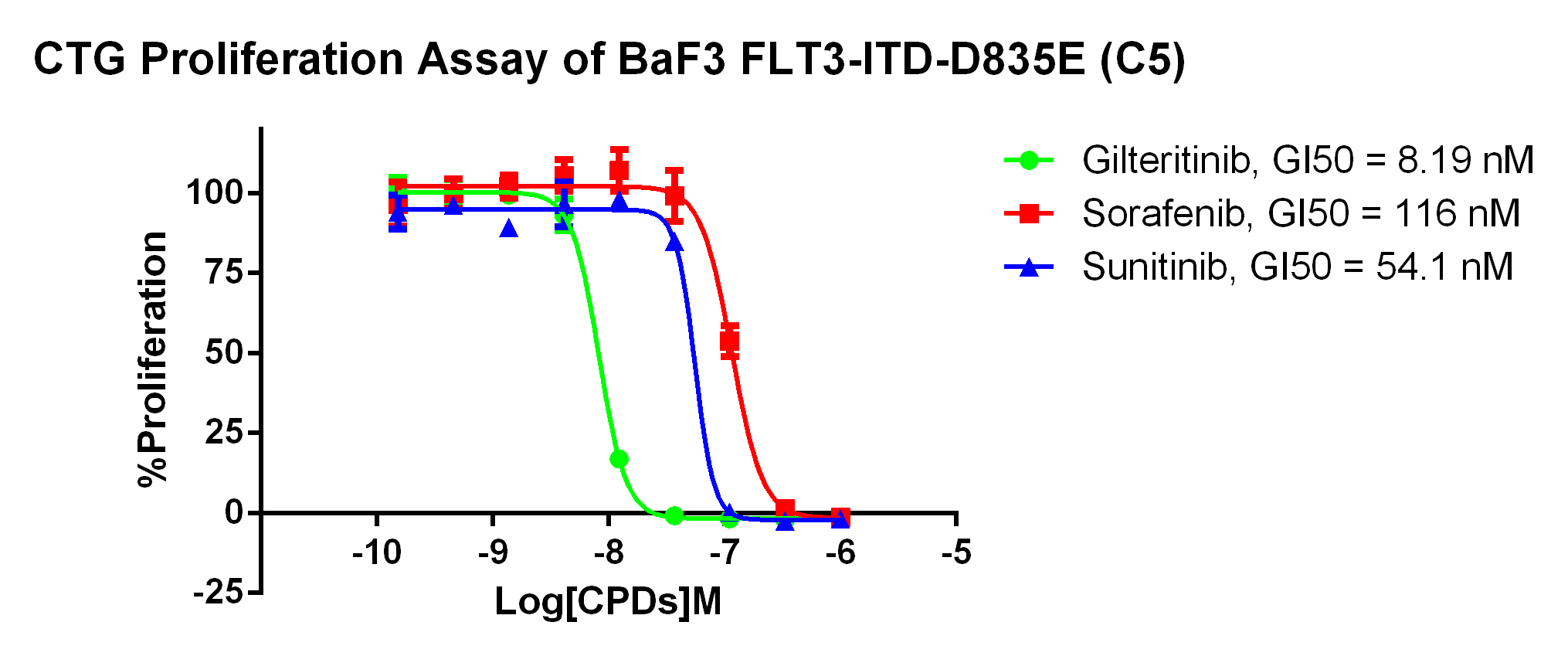 Figure 4. Anti-proliferation assay of three reference compounds on the FLT3-ITD [D835E]/BaF3 Stable Cell Line. |
