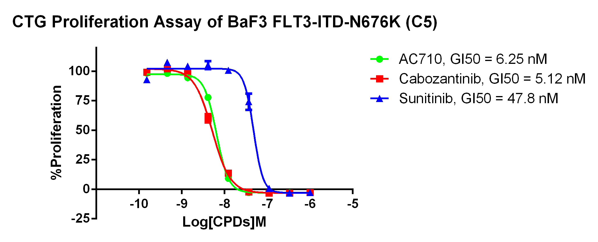 Figure 4. Anti-proliferation assay of two reference compounds on the FLT3-ITD [N676K]/BaF3 Stable Cell Line. |