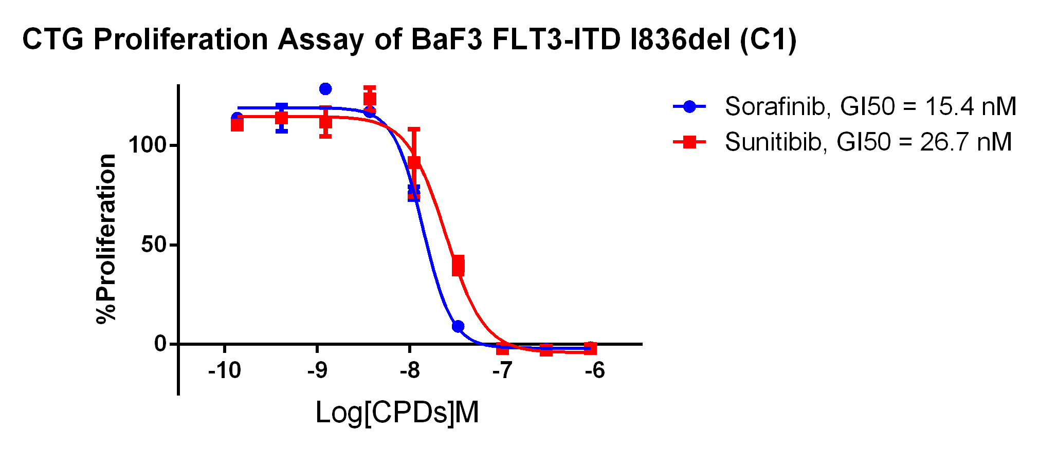 Figure 4. Anti-proliferation assay of two reference compounds on the FLT3-ITD [I836del]/BaF3 Stable Cell Line. |