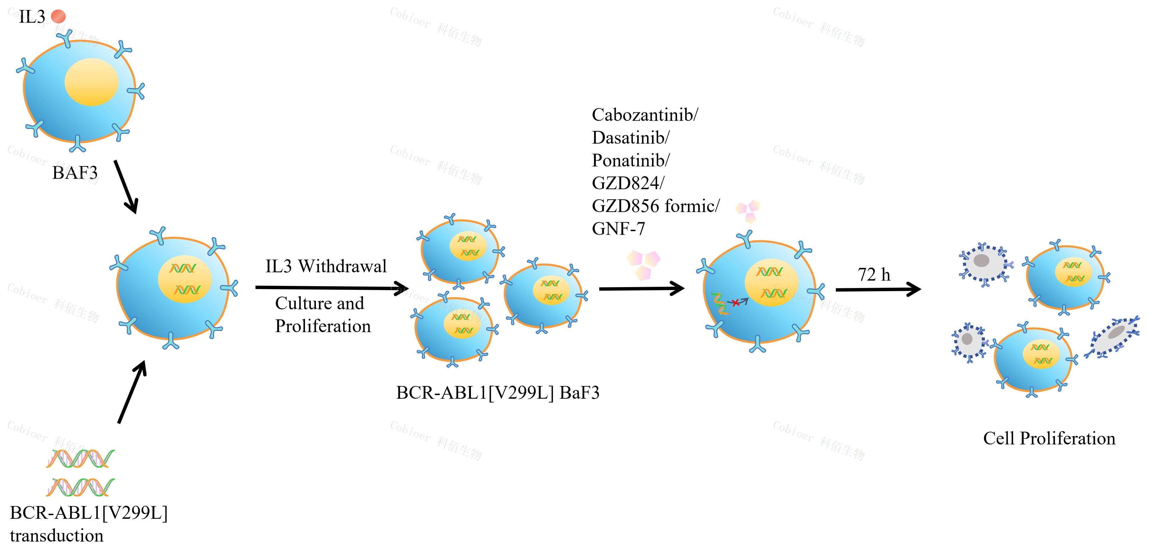 | BCR-ABL1[V299L] BaF3 藥靶細胞 , 通過轉(zhuǎn)導突變狀態(tài)的 BCR- ABL1[V299L]基因到 BaF3 細胞系中,穩(wěn)定表達人突變形態(tài)下的 BCR-ABL1[V299L]基因。 BaF3(小鼠原 B 細胞)的生長和增殖需要 IL-3 的維持。通過引入各種表達激酶的基因, 能作為 BaF3 的驅(qū)動基因,讓 BaF3 不再依賴 IL-3 而增殖,進而激酶基因成為 BaF3 增殖依賴的驅(qū)動基因,用于評估小分子藥物對激酶的靶向抑制作用,原理及流程見下圖所示。 ![]() Figure 1. BCR-ABL1[V299L] BaF3 細胞的構(gòu)建原理圖 |