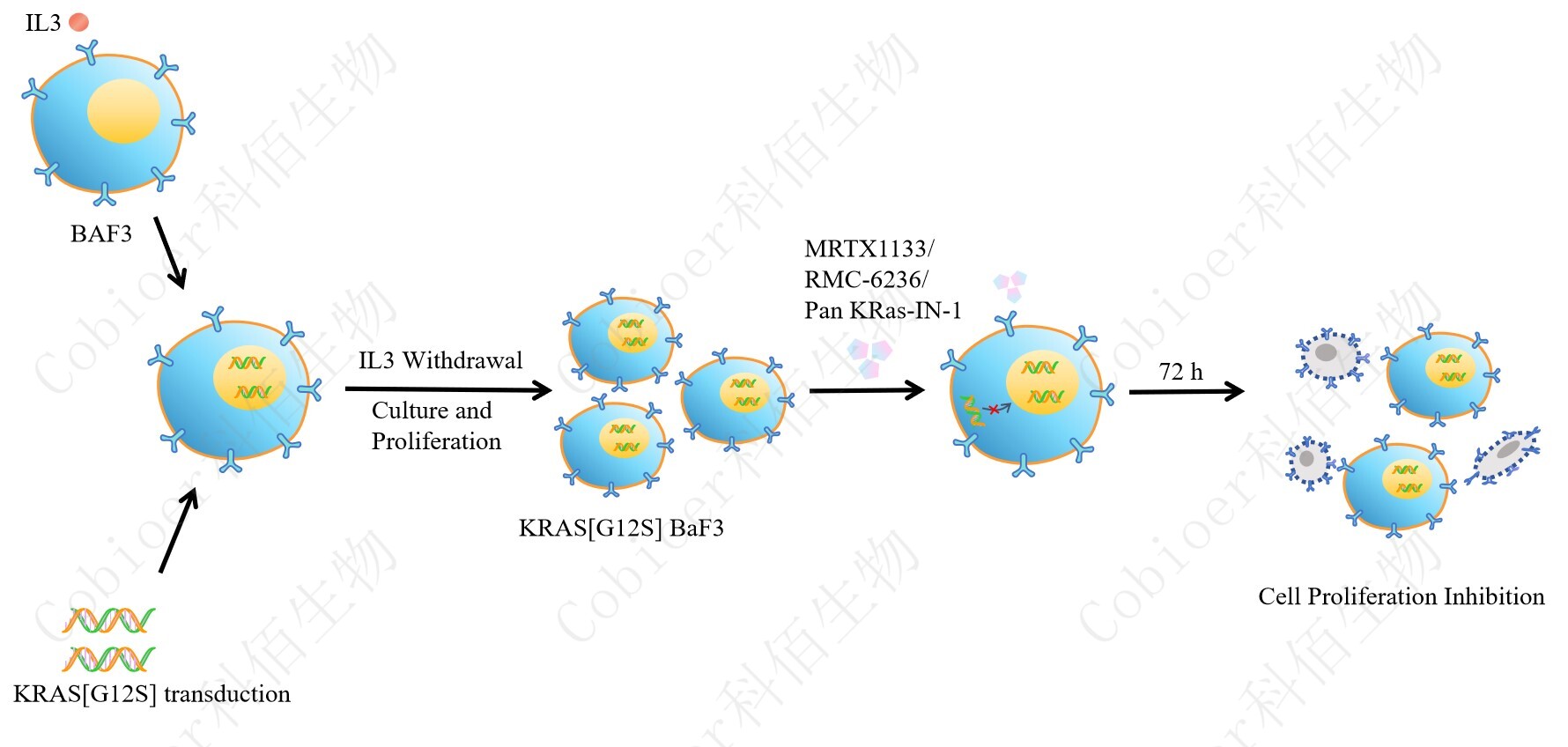 BaF3(小鼠原 B 細(xì)胞)的生長和增殖需要 IL-3 的維持。通過引入各種表達(dá)激酶的基因, 能作為 BaF3 的驅(qū)動(dòng)基因,讓 BaF3 不再依賴 IL-3 而增殖,進(jìn)而激酶基因成為 BaF3 增殖依 賴的驅(qū)動(dòng)基因,用于評估小分子藥物對激酶的靶向抑制作用,原理及流程見下圖所示。