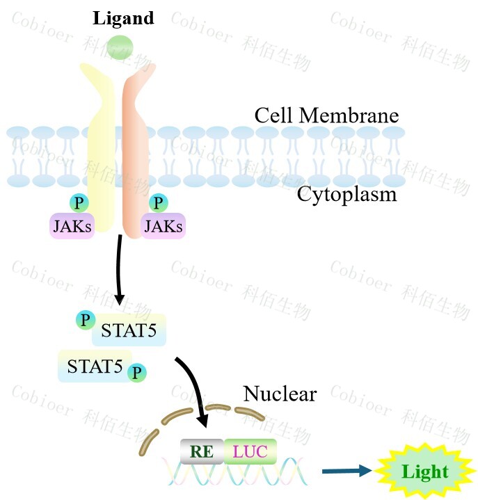STAT5-Luc TF1 報告基因細胞,是由 STAT5 調(diào)控并表達 Luc 熒光素酶報 告基因的 TF1 細胞。GM-CSF 與受體結(jié)合,激活 STAT5 的原理見下圖所示。![]() Figure 1. STAT5-Luc TF1 細胞模型原理圖 |