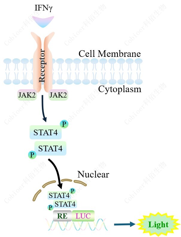 STAT4-Luc HEK293 報告基因細胞,是由 STAT4 調控并表達 Luc 熒光素 酶報告基因的 HEK293 細胞。IFNγ與受體結合,激活 STAT4 的原理見下圖所示。