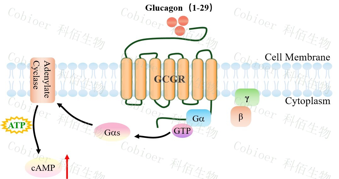 | 胰高血糖素是一種胰腺肽激素,作為胰島素的反調(diào)節(jié)激素,刺激葡萄糖通過肝臟釋放, 維持葡萄糖穩(wěn)態(tài)。GCGR 是一種 B 類 GPCR,最初被描述為與腺苷酸環(huán)化酶功能相連的胰 高血糖素結(jié)合體。它在維持葡萄糖穩(wěn)態(tài)中起關(guān)鍵作用,因此被認(rèn)為是治療糖尿病的一個(gè)有 價(jià)值的靶點(diǎn)。 GCGR 的天然配體是胰高血糖素。胰高血糖素與受體結(jié)合激活 Gs 蛋白,從而激活腺苷 酸環(huán)化酶。GCGR 受體與天然配體胰高血糖素結(jié)合調(diào)節(jié)體內(nèi)葡萄糖穩(wěn)態(tài),是Ⅱ型糖尿病的 重要藥物靶點(diǎn)。 |