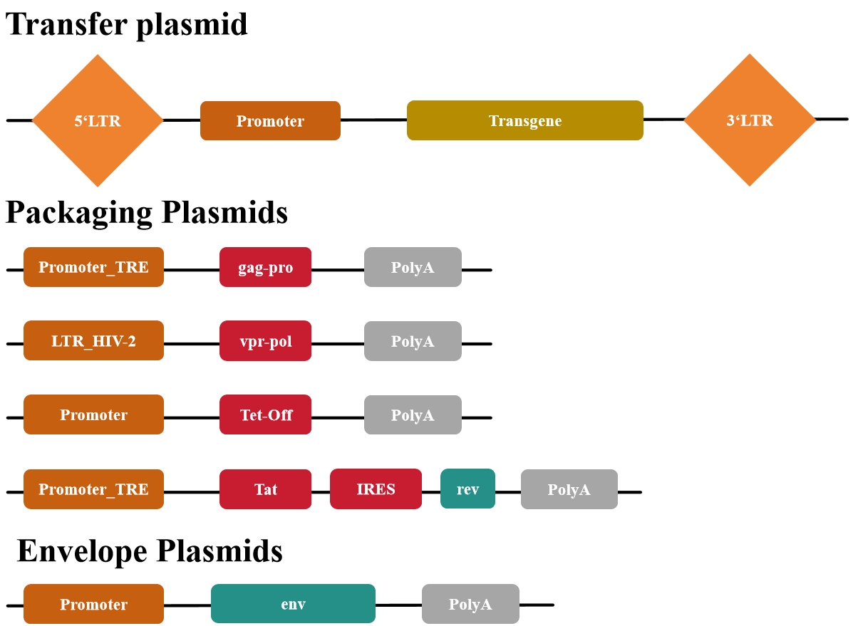 第一代慢病毒質(zhì)粒缺乏安全性改進(jìn)以及無法生產(chǎn)具有復(fù)制能力的慢病毒(即產(chǎn)生能夠感染細(xì)胞并進(jìn)一步自我復(fù)制的病毒顆粒),基本已經(jīng)廢棄使用了。