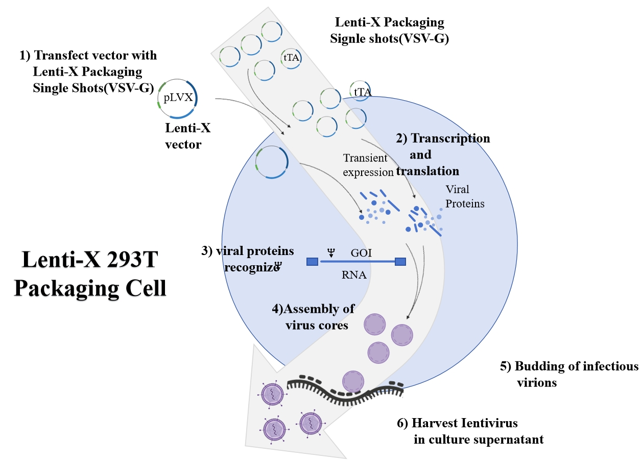 慢病毒(LV)是一種有包膜的病毒,最常見的是VSV-G,它通過與特定的細(xì)胞表面蛋白(比如LDLR)結(jié)合,隨后進(jìn)行膜融合進(jìn)入細(xì)胞,將含有其遺傳信息的病毒RNA注入細(xì)胞質(zhì)。這種單鏈病毒RNA通過逆轉(zhuǎn)錄轉(zhuǎn)化為DNA。病毒DNA進(jìn)入細(xì)胞核,并通過病毒整合酶整合到宿主細(xì)胞基因組中。
