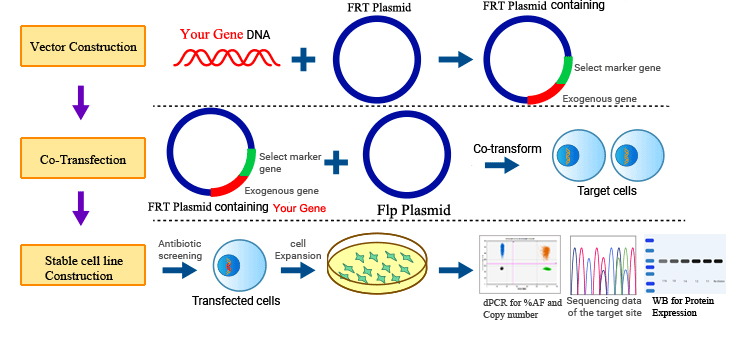 Flp-FRT整合系統(tǒng)是一種用于構建穩(wěn)定細胞系的方法,該細胞系可在宿主細胞基因組的特定位置表達目的基因。該系統(tǒng)利用 Flp 重組酶和 FRT(Flp 重組靶位)位點實現(xiàn)位點特異性重組和整合。該系統(tǒng)可實現(xiàn)目的基因的穩(wěn)定表達,確保細胞中蛋白質(zhì)的持續(xù)生產(chǎn)。